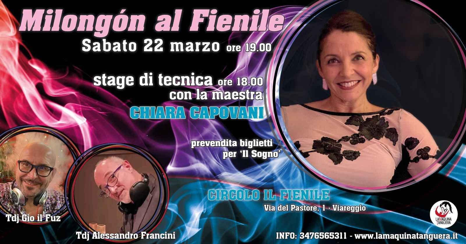 L'associazione La Maquina Tanguera Carrara é lieta di invitarvi al Milongón al Fienile di Viareggio! vi aspettiamo alle ore 18,00 per studiare insieme alla maestra Chiara Capovani: lezione di tecnica individuale maschile e femminile - livello unico.