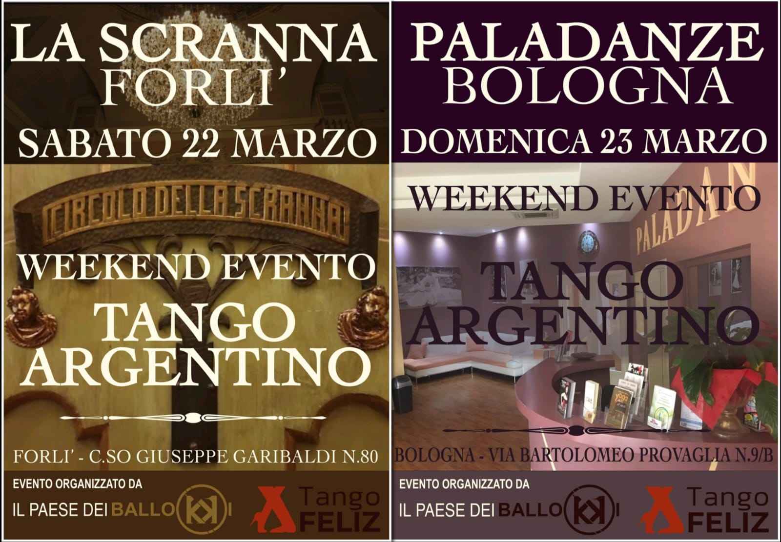 Special Anniversary di Tango Feliz e Il Paese dei Ballokki (Bologna e Forlì)sette anni insieme fatti di passione, di impegno, di rispetto ma anche di eventi, vacanze e tanto altro!per l'occasione abbiamo organizzato un week end di studio, ballo e show a Forlì (con un pomeriggio di stage e la Milonga nel bellissimo Palazzo storico della Scranna) e a Bologna (con un pomeriggio di stage e la Milonga al Paladanze).sarà un percorso didattico con i maestri Chiara Benati e Andrea Vighi, concentrato su Tango Vals e Milonga e diviso nelle due giornate di studio, che faranno giocare con il ritmo, la fluidità e l'eleganza di questi due stili di Tango, per andare in pista sicuri e ballare con più libertà e piacere!inoltre, uno stage di tecnica individuale per migliorare postura, equilibrio, precisione ed eleganza e per scoprire alcuni segreti che faranno la differenza nel proprio ballo.e le due Milonghe del sabato a Forlì e della domenica a Bologna, con Tj Adan El Capitan e Ombre la Flaca (sabato) e Radu (Domenica)unisciti a noi!
