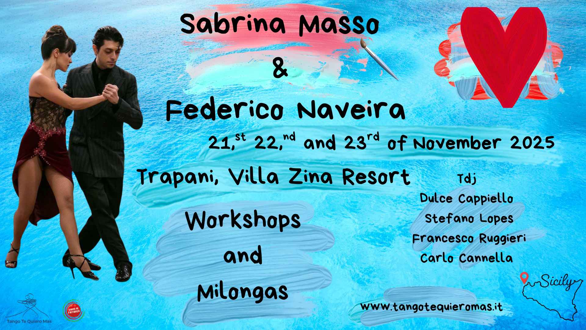 Sabrina Masso & Federico Naveira   21 -23 novembre 2025  presso Villa Zina Resort Custonaci (Tp) sito www.tangotequieromas.it