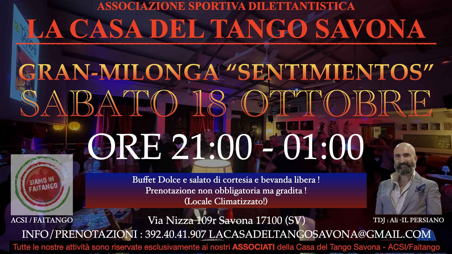 😍 Sabato (Savona) 😍 Gran-milonga “sentimientos” con orario anticipato! presso La Casa del Tango Savona Asd 21:00 - 01:00 selezione musicale a cura di : Ali (Il Persiano) richiesta la Tessera Acsi/faitango 2025! info / prenotazioni Gradite : 392.40.41.907 lacasadeltangosavona@gmail.com https://tangoasavona.blogspot.com