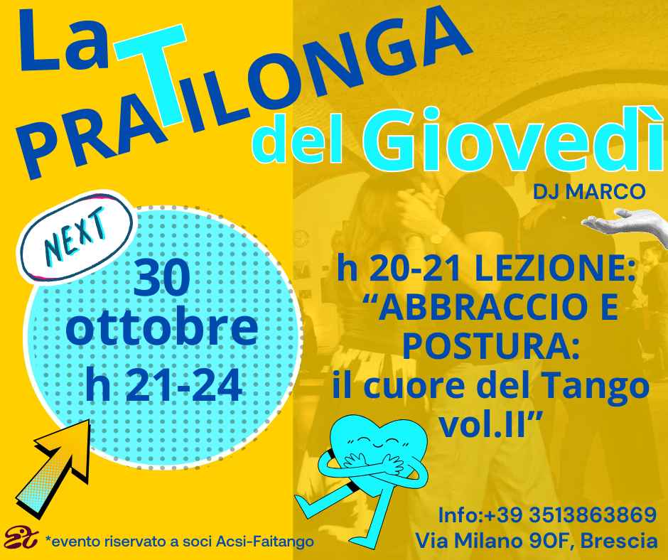 Dalle 21.00 alle 00.00 pratilonga: si balla nella suggestiva sala di via Milano a Brescia, se non l'hai ancora vista, ti aspettiamo a conoscerla, con nuovo pavimento perfetto per il tango!