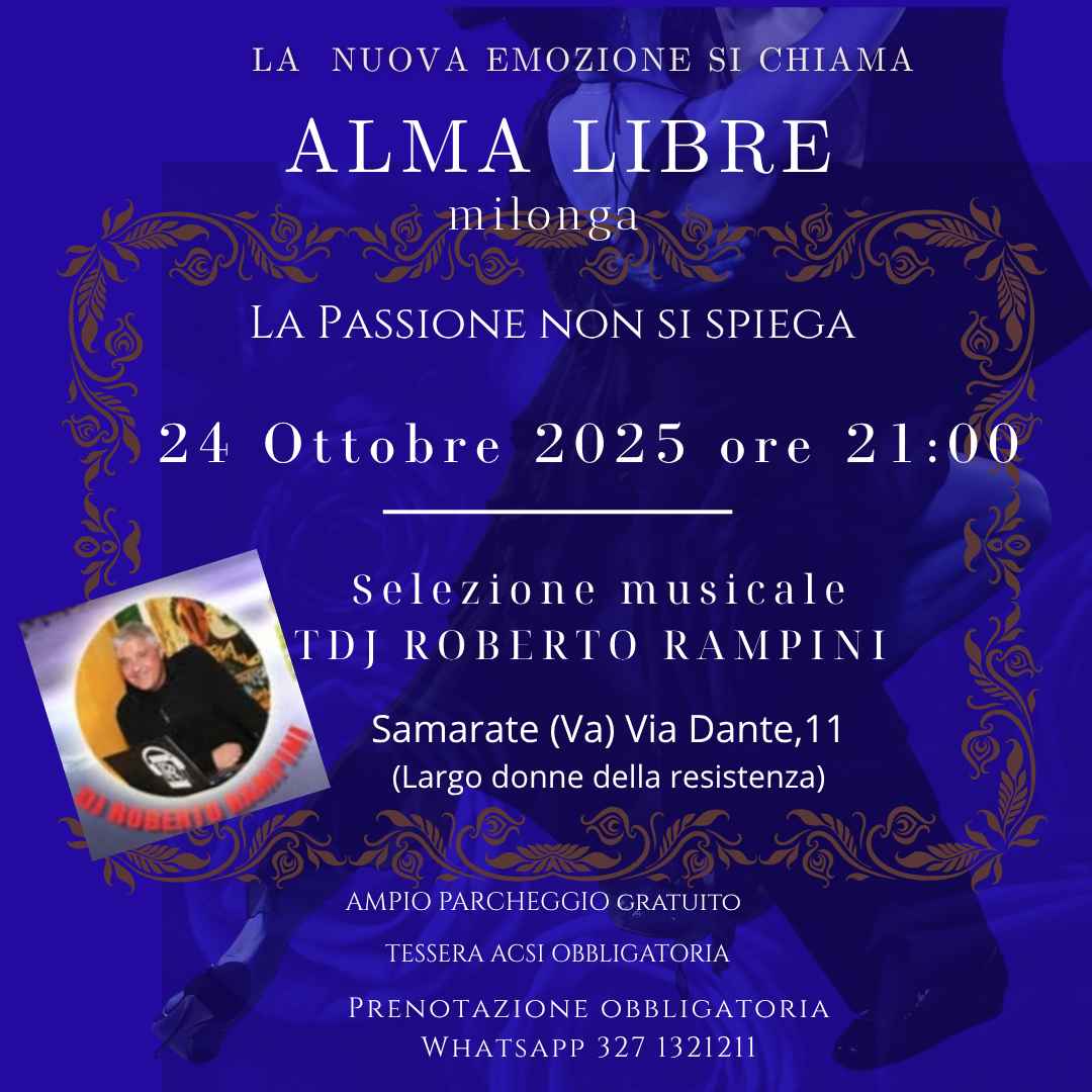 Il Venerdì sera è Tango, Il Tango è Alma Libre ! Alma Libre, la milonga degli abbracci veri, della musica che emoziona in un’atmosfera calda e libera proprio come il tango. Stasera Musicalizza: Roberto Rampini Tdj