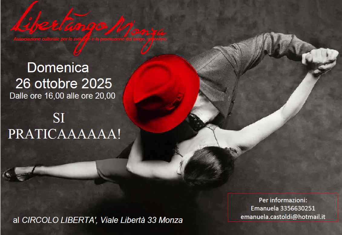 pratica Mensile di Tango – Domenica Pomeriggio dalle 16:00 alle 20:00📍 Dove: Monza Via Libertà 33 Circolo Libertà🎶 Cosa: Una pratica libera di Tango Argentino, pensata per ritrovarsi, ballare, chiacchierare e condividere la passione in un ambiente caldo e accogliente🧉 Atmosfera: rilassata, con musica di Tango tradizionale e spazi per socializzare💸 Ingresso: Con offerta libera – il contributo è volontario e apprezzato👥 Aperta a tutti: Non è necessario essere in coppia o iscritti a una scuola