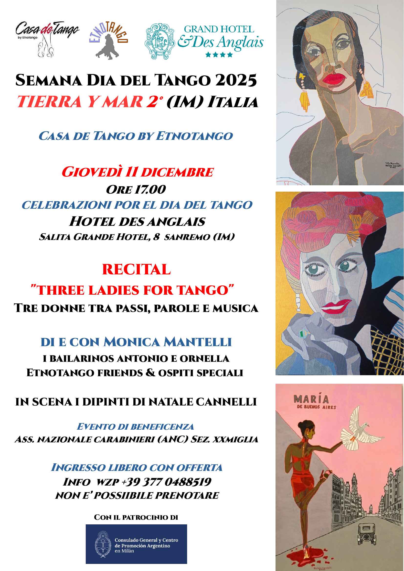 Infine, grande celebrazione finale Giovedì 11 dicembre alle ore 17 presso il prestigioso Grand Hotel & des Anglais di Sanremo: ultimo appuntamento della rassegna Tierra y Mar con il Recital Three Ladies For Tango. Tre figure femminili del tango a confronto tra vizi, virtù e aspirazioni: Tita Merello, Maria de Buenos Aires, Evita Peron. Di e con Monica Mantelli, esperta di cultura rioplatense e direttrice artistica della rassegna. Musica, parole, recitazione e qualche passo di tango con i bailarinos Etnotango Friends Antonio e Ornella intorno al concetto di “poetica esistenziale conturbante". Opere pittoriche in scena a firma di Natale Cannelli.