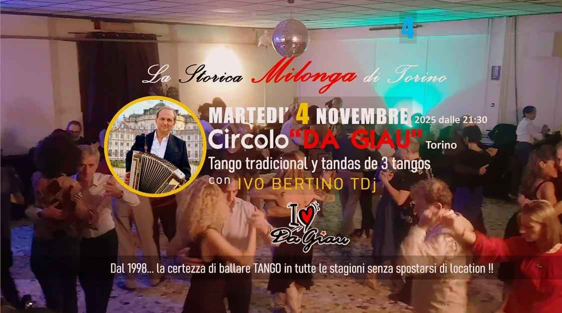 Il circolo "da Giau" propone una serata interamente dedicata al Tango Argentino, che, con oltre trent'anni di attività ininterrotta, rappresenta l’appuntamento storico e più duraturo nel panorama delle Milonghe Torinesi. A partire dalle ore 21:30 tutti gli appassionati di questa sensuale danza potranno abbandonarsi sulle note dei più bei temi delle Milonghe di Buenos Aires.