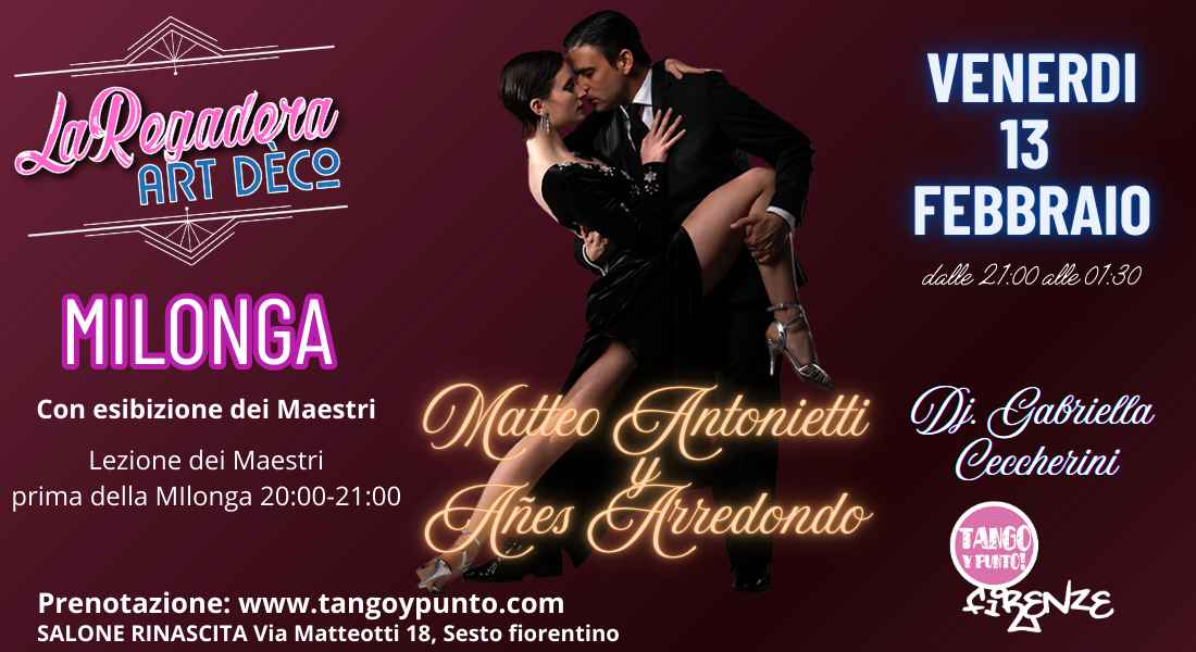 Ospiti i Maestri Matteo Antonietti e Añes Arredondo che terranno una lezione di Milonga prima della milonga e poi si esibiranno durante la serata