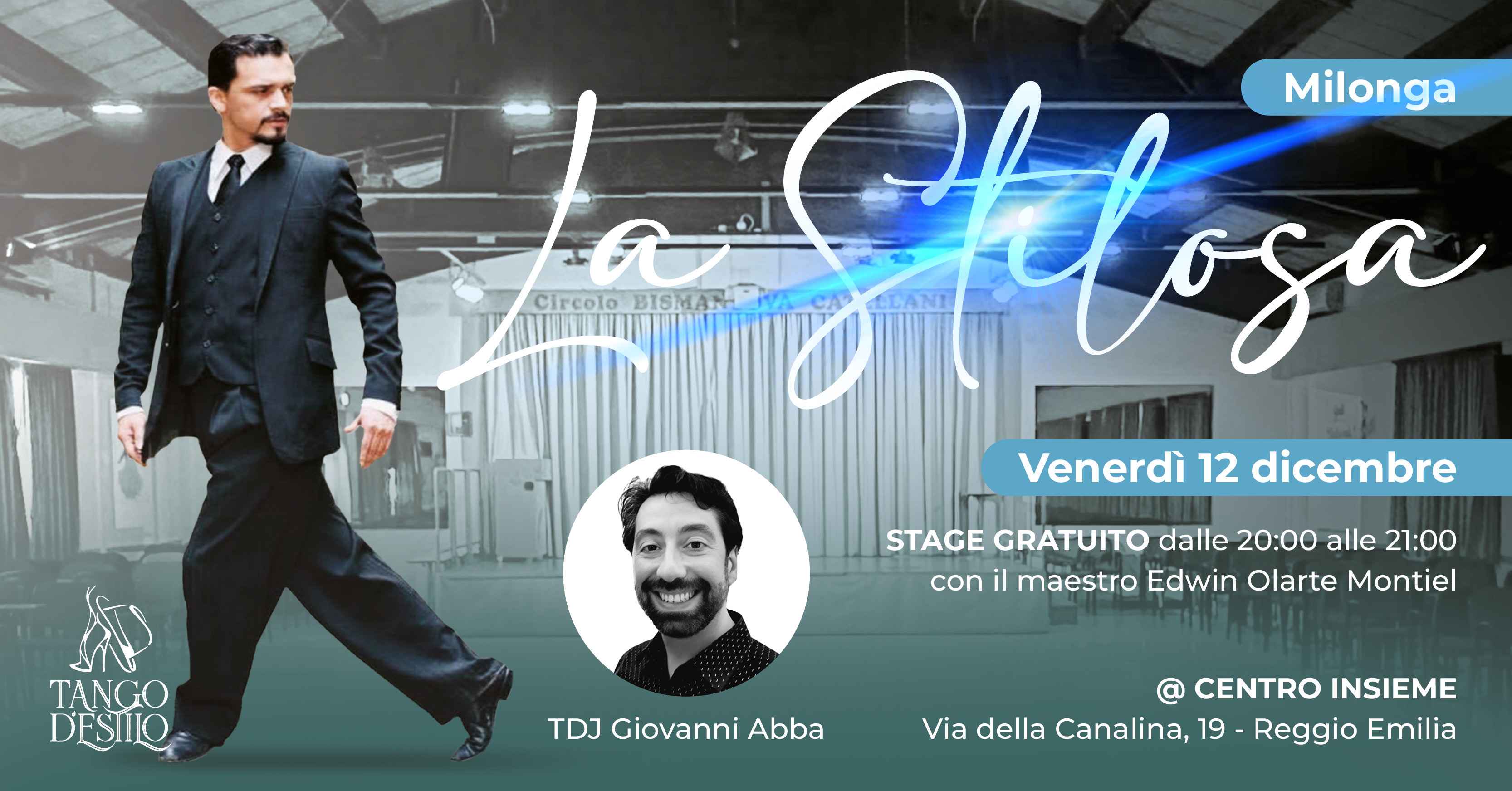 Appuntamento mensile con la Milonga La Stilosa, venerdì 12/12/2025 presso il Centro Insieme (Via Della Canalina 19/1 42123 Reggio emilia) ospite della serata Tdj Giovanni Abba ora inizio evento: 21:00 Ora fine evento: 02:00 stage gratuito (20.00 – 21.00) del ballerino e maestro Edwin leonardo Olarte contributo unico: 15 euro ospite Atelier Tacco Punta con una selezione di raffinati abiti e scarpe da ballo. per avere informazioni o prenotare potete inviare un messaggio whatsapp con nome e cognome al 3930421099 (Francesca) se invece non volete prenotare c'è posto anche per voi! La sala è grande e spaziosa, e ci saranno molte sedie a disposizione... ma fino ad esaurimento posti. nb: si ricorda che l'evento è accessibile solo a chi in possesso di tessera A.r.c.i. (chi sprovvisto potrà farla in loco al costo di 13,00 euro).