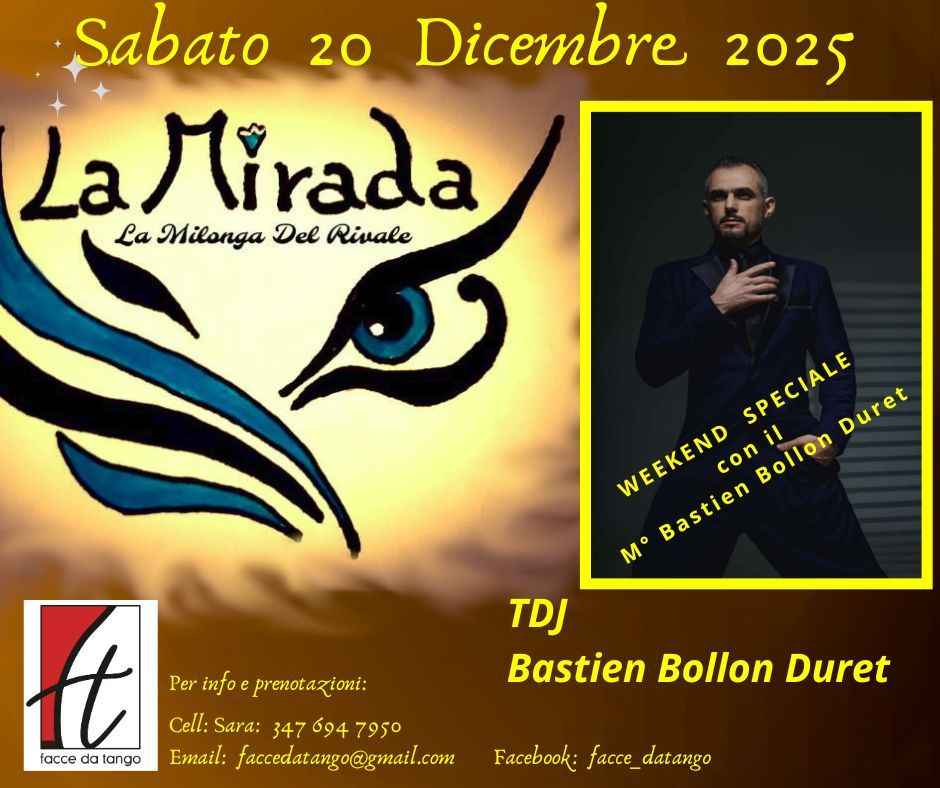 Siamo lietissimi di annunciare un intero, intensissimo week-end di studio e ballo. Sarà con noi un maestro, ballerino e Tj eccezionale, da Lione con la sua indiscutibile eleganza e raffinatezza: Bastien Bollon Duret!!!tutto il week-end si svolgerà nella sede de La Mirada in Via del Pettirosso 25 fraz. San Marco – Ravenna.ecco il programma (per info, costi e iscrizioni contattare Sara ai riferimenti sotto):sabato 20/1217,00-18,15: Comunicaciòn: una mejor comunicaciòn por ayudar a sentirte mejor con tu pareja
