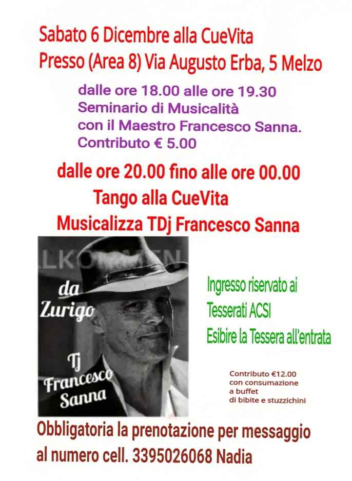Seminario di musicalità pre-milonga Presentazione del libro e del metodo “tango la Musicalità” A cura di Francesco Sannaun incontro dedicato alla musicalità nel tango, pensato per ballerini di ogni livello, singoli o in coppia. Il seminario propone un percorso teorico-pratico per approfondire la relazione tra musica e movimento, attraverso il metodo “tango la Musicalità”. parte tecnica Struttura musicale del tango Accenti e dinamiche musicali Passi ritmici: mezzo tempo, tempo regolare e semplice, doppio tempo, controtempo, pause, corrida e sincopeparte pratica Consapevolezza corporea sui passi ritmici Percezione e risposta agli impulsi musicali e del partner Differenza tra udire e sentire la musica Coreografie ritmiche e melodichel’incontro si apre con una breve introduzione teorica (10–15 minuti), seguita da esercizi pratici e tecnici. Il linguaggio sarà semplice e pensato per i ballerini, con il supporto di grafici e brani musicali selezionati appositamente.contributo € 5.00