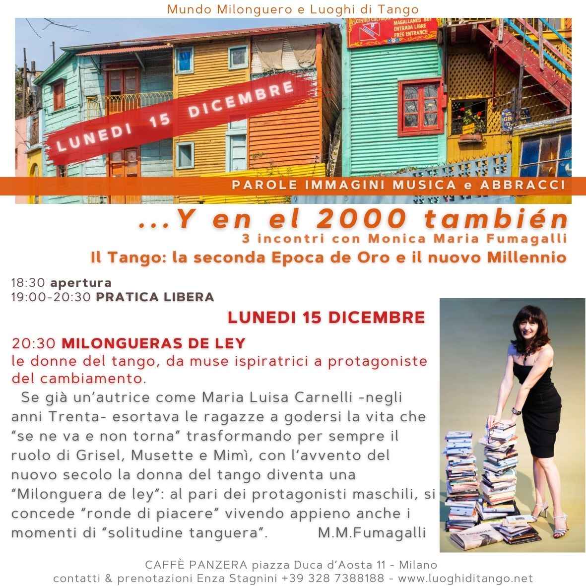 “MILONGUERAS De Ley”: le donne del tango, da muse ispiratrici a protagoniste del cambiamento.se già un’autrice come Maria Luisa Carnelli, negli anni Trenta, esortava le ragazze a godersi la vita che “se ne va e non torna” trasformando per sempre il ruolo di Grisel, Musette e Mimì, con l’avvento del nuovo secolo la donna del tango diventa una “milonguera de ley” che, al pari dei protagonisti maschili, si concede “ronde di piacere” vivendo appieno anche i momenti di “solitudine tanguera”.