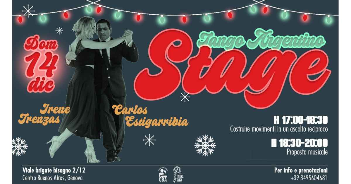 📅 Domenica 14 dicembre – Stage al Cba GenovaIl Cba ospita Carlos Estigarribia e Irene Trenzas per un pomeriggio di approfondimento tecnico per creare il proprio tango all’interno della coppia a partire da un attento studio musicale.