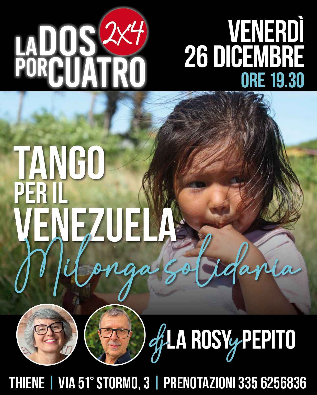 Tango per il Venezuela ore 19,30 Come ogni anno, Vivitango apre il cuore e la pista per una serata davvero speciale: la nostra Milonga Solidaria, dedicata all’associazione Benposta, che ogni giorno offre aiuto, protezione e un sorriso ai bambini del Venezuela che non hanno una casa né una famiglia. nel nostro piccolo vogliamo fare la differenza: tutto il ricavato della serata sarà devoluto a Benposta.