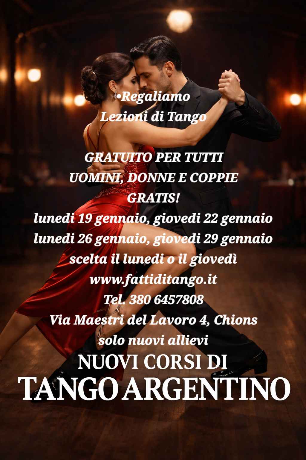a gennaioancora  lezioni omaggio per chi viene a provare prenota al 380 6457808giorni di lezione Corsi Principianti e open roleLunedì — ore 20.30Giovedì — ore 20.30Venerdì — ore 20.00  Lezioni individuali negli stessi giorni in orario a scelta