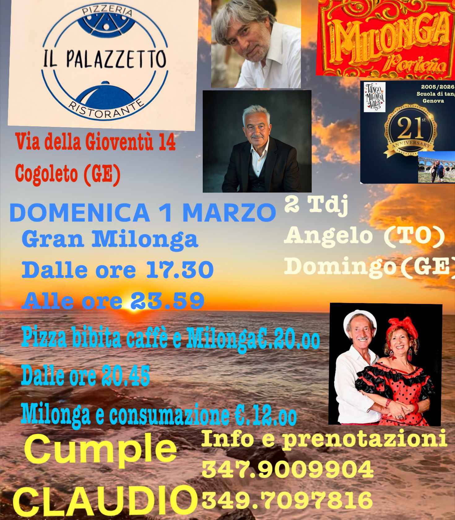 Domenica 1 marzogran Milongail Palazzettovia Della Gioventù 14cogoleto Genovaanpio parcheggio gratuitodalle ore 17,30 Gran Milongatdj Domingo (dal 2005)e Angelo (To)pizza bibita caffè €.20.oooppure a menùampia pista ballabileinfo 347.9009904349.7097816 E compleanno Claudio