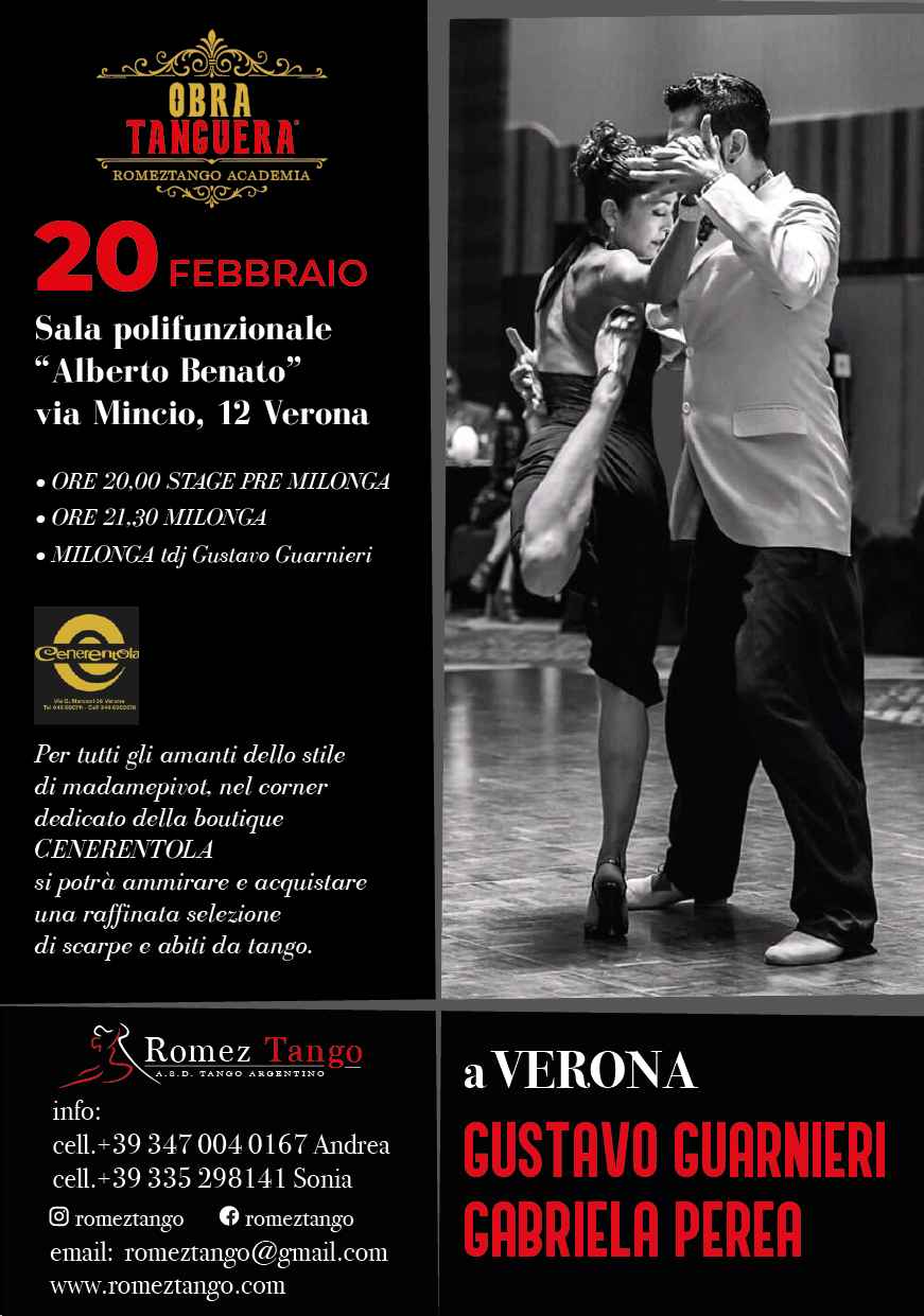 Venerdì 20 e sabato 21 febbraio 2026, Romeztango presenta Obra Tanguera, L’accademia Di Romeztango per la promozione della cultura del tango argentino in tutti i suoi aspetti: tecnica e postura, musicalità, storia della musica e cultura tanguera. Eventi nazionali esclusivi finalmente a Verona, tenuti da maestri internazionali, rivolti a tutti i ballerini interessati ad approfondire lo studio di alto livello e a vivere un percorso intenso e stimolante.i maestri argentini Gustavo Guarnieri e Gabriela Perea saranno i primi artisti ospiti della nostra selezione:venerdì 20 e sabato 21 febbraio 2026, un weekend di studio avanzato con stage e stage pre-milonga, lezioni private per tangueri di tutti i livelli e masterclass per insegnanti, milonghe ed appassionanti esibizioni di due protagonisti assoluti del tango in Italia.preparatevi a vivere un’esperienza di tecnica ed emozione unica a Verona firmata Obra Tanguera, l’accademia di RomezTango!