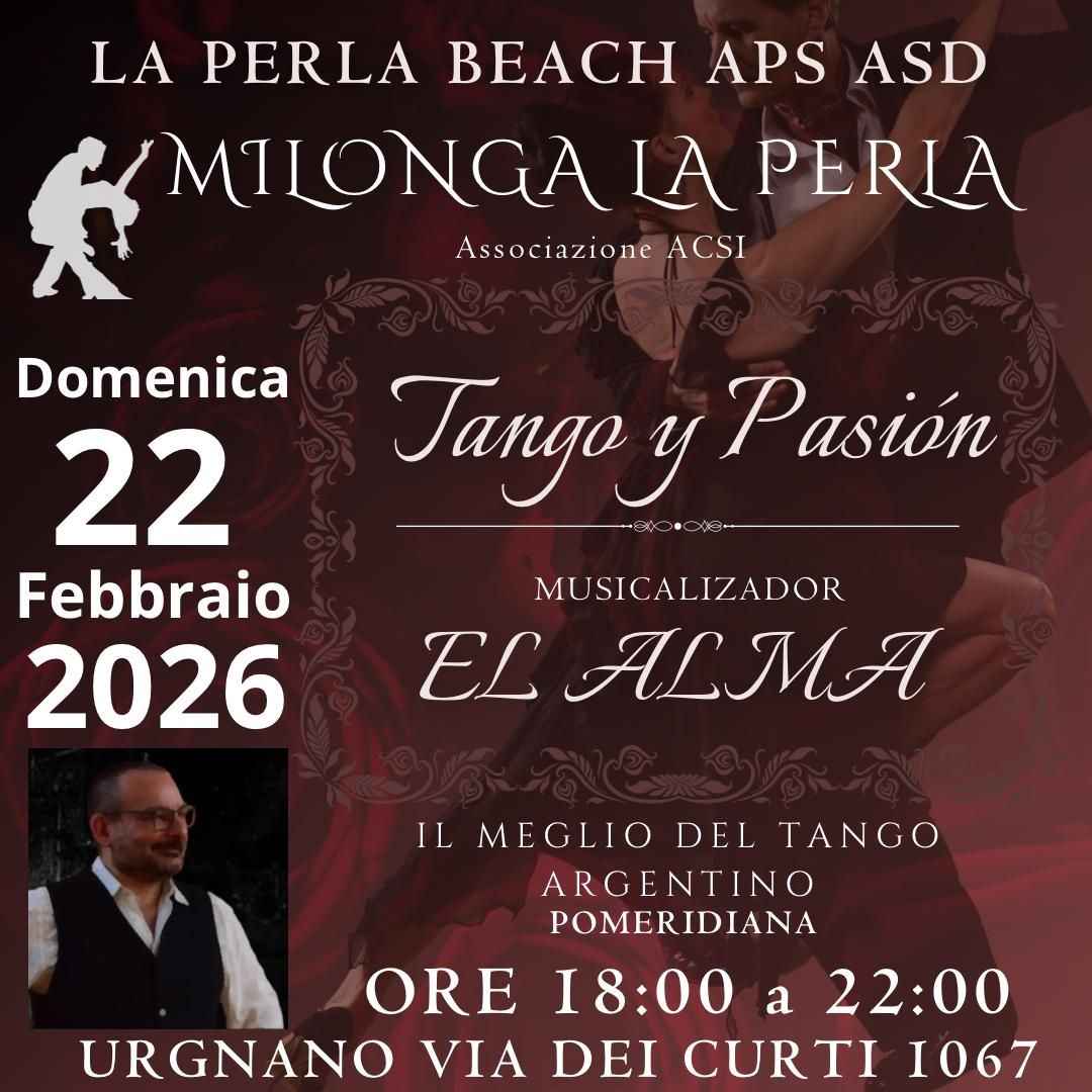Con enorme piacere annuncio una nuova collaborazione con la "milonga Alla Perla" selezione musicale del tdj El Alma apprezzatissimo per le sue scelte musicali.milonga domenica 22 febbraio 2026 dalle 18:00 a 22:00.localita: Via Dei Curti 1067, Urgnano , Bergamoingresso 13€ Compreso di prima consumazione e buffet.musicalizador della serata:"el Alma" Tdj Ingresso riservato ai soci: Tessera Acsi La Perla Beach 10€ valida fino al 31-12-26 per tuttiper Info e prenotazioni anche whatsapp mandare un messaggio a: Michael 3487378614 - 3492133644Antonella Dario Tangoymas 3925149130