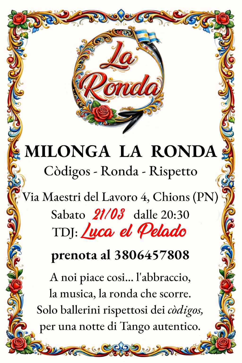C'è un nutrito gruppo di persone che ama il tango milonguero: fatto di educazione, rispetto e musica.persone che non vanno a ballare per mostrarsi, ma per condividere momenti di puro piacere in abrazo cerrado. per queste persone nasce La Milonga – La Ronda di Chions.un luogo dove la ronda è sacra, l’abbraccio è vero e il tango torna ad essere quello che è sempre stato: incontro, ascolto, connessione.il tango come una volta, per chi sa riconoscerlo