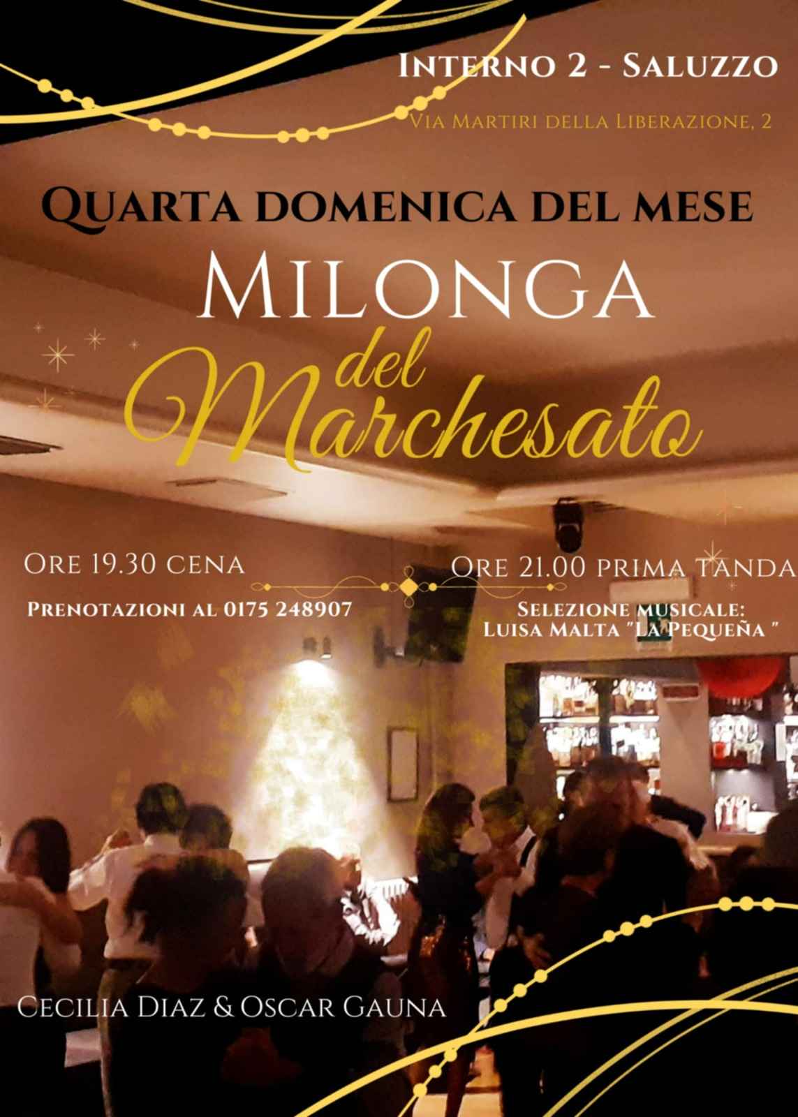 Domenica 22 marzo si balla a Saluzzo,nella Tradizionale e Storica "milonga del Marchesato" presso gli eleganti localidell’interno 2.ore 21.00selezione musicale: Luisa Malta "la Pequeña"