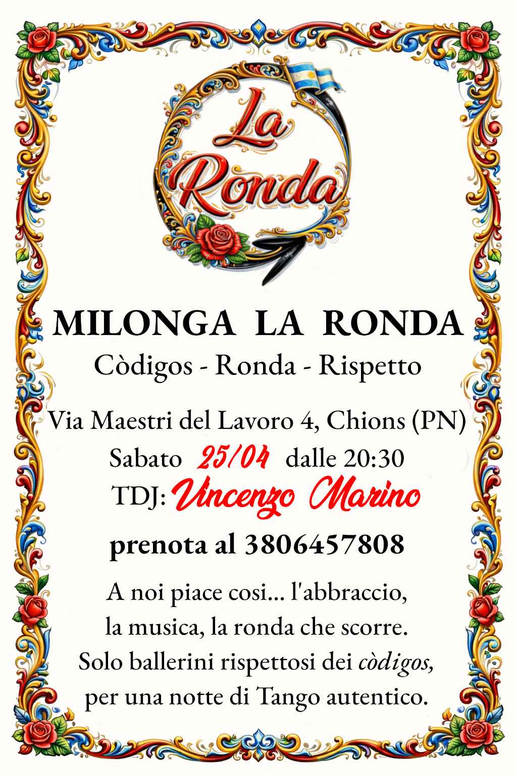 Una Milonga per chi ama l'abbraccio, la musica, la ronda che scorre...per ballerini amanti dei codigos, per una notte di tango educato, in locale dotato di uscita antipanico, estintore, defibrillatore.ampio parcheggio, apericena, contributo associativo 15€bilanciamento uomini/donne, prenotazione tramite modulo o scrivendo al 3806457808, posti limitati.https://forms.gle/qUDZpLjVNQkatT2x5