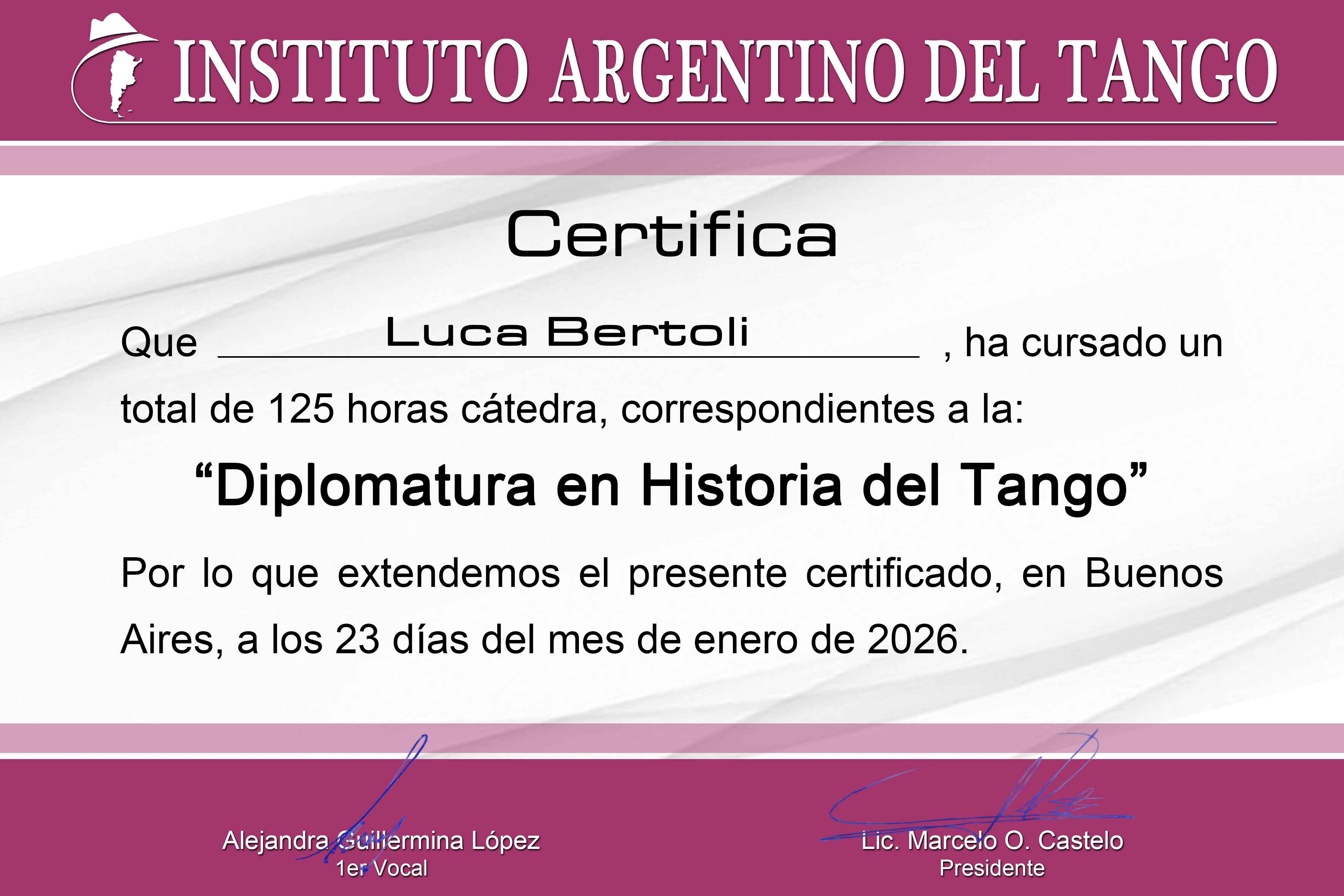 Nel 2026 ho completato il corso "diplomatura en Historia del Tango" presso l'instituto Argentino del Tango (Iat ).