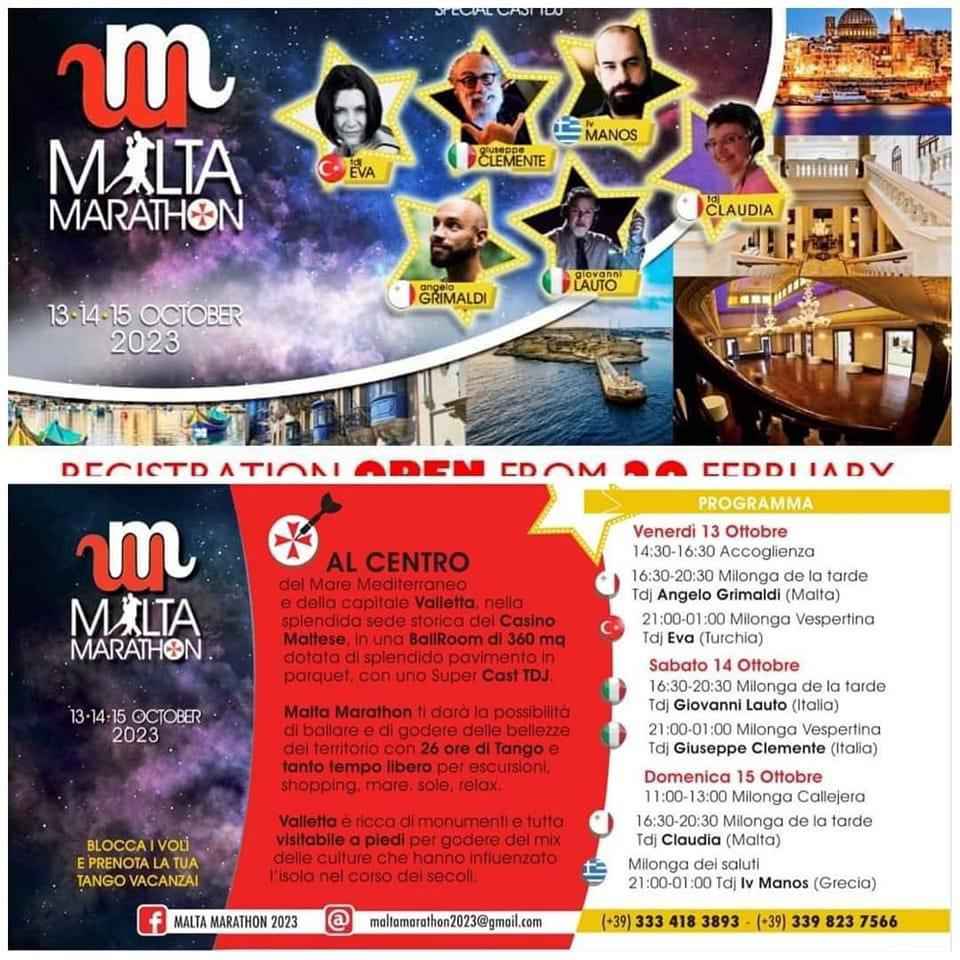 Maratona a Malta ?? località la valletta 13-14-15 Ottobre 2023 dalle 16 fino alle 1.30 presso casino maltese località la valletta corso republic ! Tango argentino con 6 Dj international