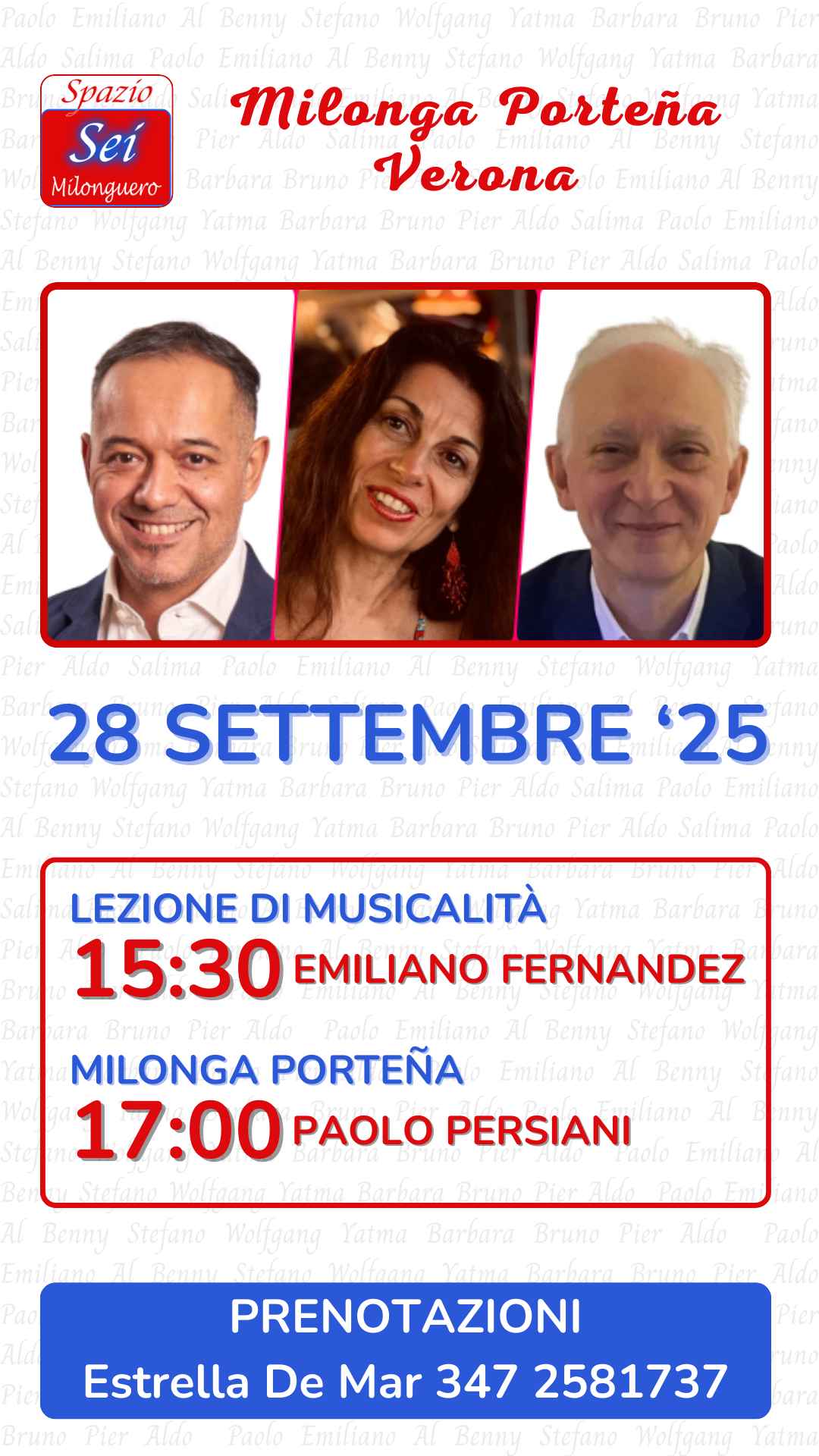 Chi si iscrive singolarmente riceverà conferma su Whatsapp. 𝗗𝗜𝗦𝗗𝗘𝗧𝗧𝗘: 𝘀𝗶𝗲𝘁𝗲 𝗽𝗿𝗲𝗴𝗮𝘁𝗶 𝗶𝗻 𝗰𝗮𝘀𝗼 𝗱𝗶 𝗰𝗼𝗻𝘁𝗿𝗮𝘁𝘁𝗲𝗺𝗽𝗶 𝗱𝗶 𝗶𝗻𝗳𝗼𝗿𝗺𝗮𝗿𝗺𝗶 𝗽𝗿𝗼𝗻𝘁𝗮𝗺𝗲𝗻𝘁𝗲 𝗽𝗲𝗿 𝗽𝗲𝗿𝗺𝗲𝘁𝘁𝗲𝗿𝗲 𝗮 𝗰𝗵𝗶 𝗲̀ 𝗶𝗻 𝗹𝗶𝘀𝘁𝗮 𝗱𝗶 𝗮𝘁𝘁𝗲𝘀𝗮 𝗱𝗶 𝗽𝗼𝘁𝗲𝗿 𝗽𝗮𝗿𝘁𝗲𝗰𝗶𝗽𝗮𝗿𝗲la milonga è allestita in una bellissima sala con parquet e dista a soli