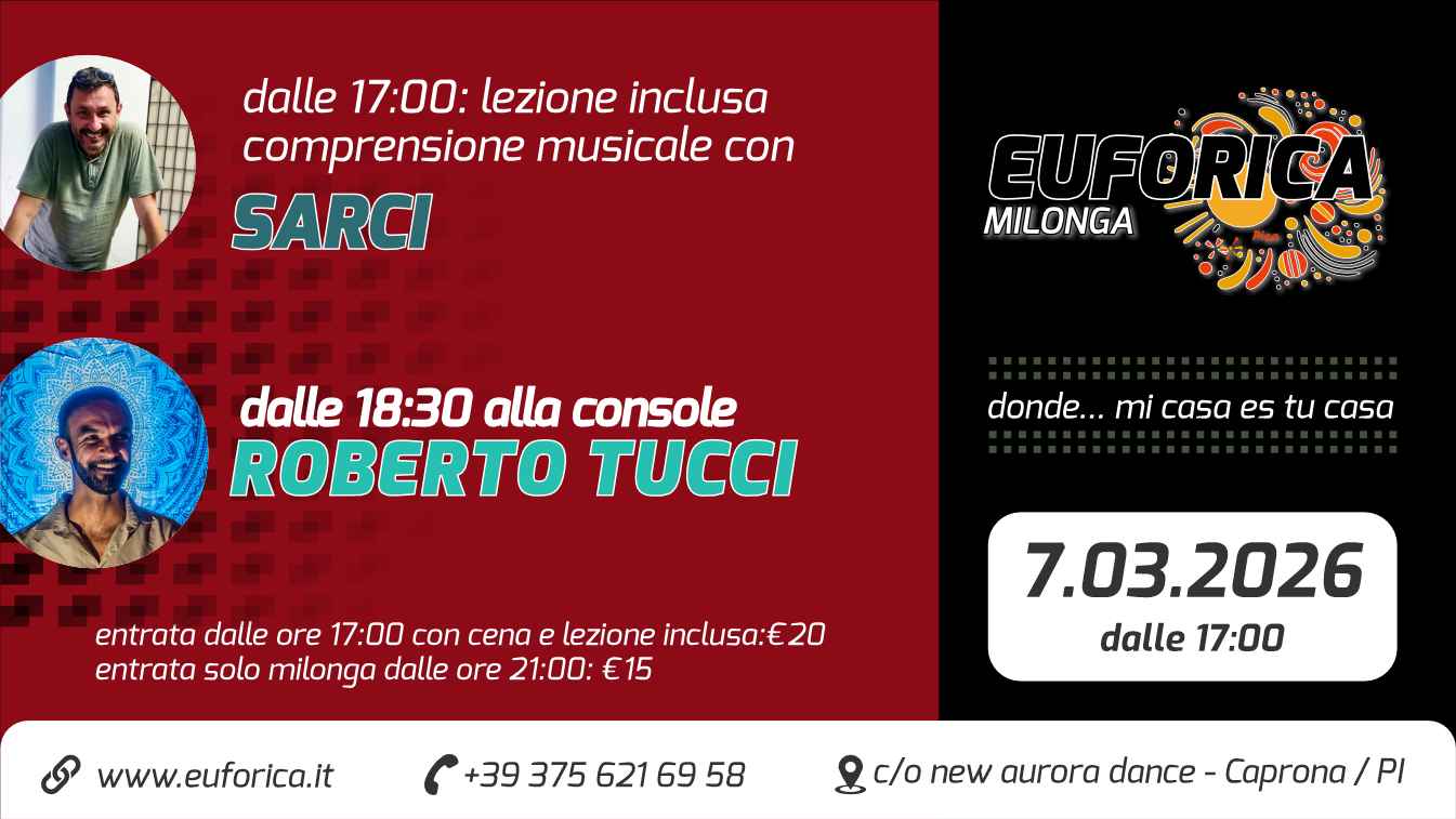 Dalle 17:00 : entriamo nel cuore della musica con la lezione di comprensione musicale con Sarci. Lezione, cena e milonga: €20 dalle 18:30: alla console Roberto Tucci. Musica che racconta, guida, accende la pista. Ingresso solo milonga dalle 21:00: €15 buffet e bevande open (alcoliche e analcoliche) per tutta la serata, per tutti.