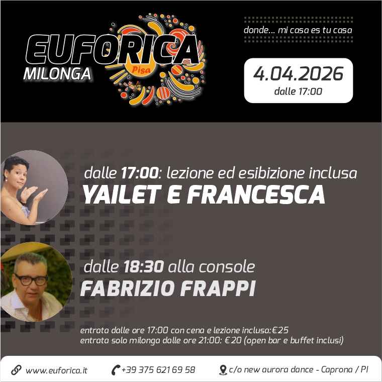Ingresso solo milonga dalle 21:00: €15 - (open bar e buffet (fino alle 24:00) inclusi) ed esibizione di Yailet Suarez e Francesca Bonazzi. Non necessita prenotazione.