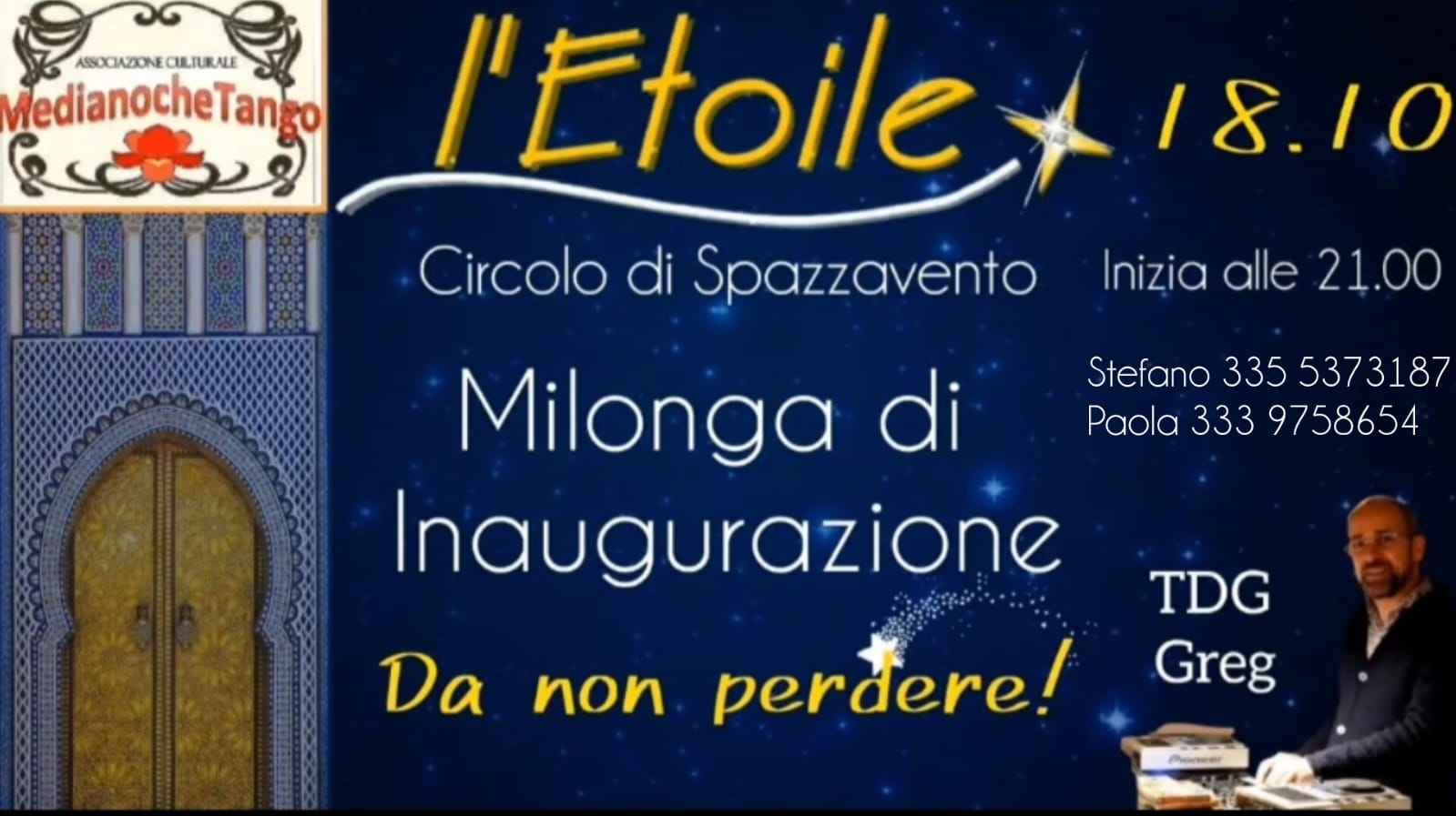 Inaugurazione nuova stagione della milonga " L' Etoile " nella sala del Circolo di Spazzavento con nuovi arredi e corredi .... Una nuova occasione per ritrovarsi e divertirsi in un’ ambiente informale aperta a tutti quelli che desiderano la condivisione e emozione del Tango socialealla Consolle Greg da Bologna