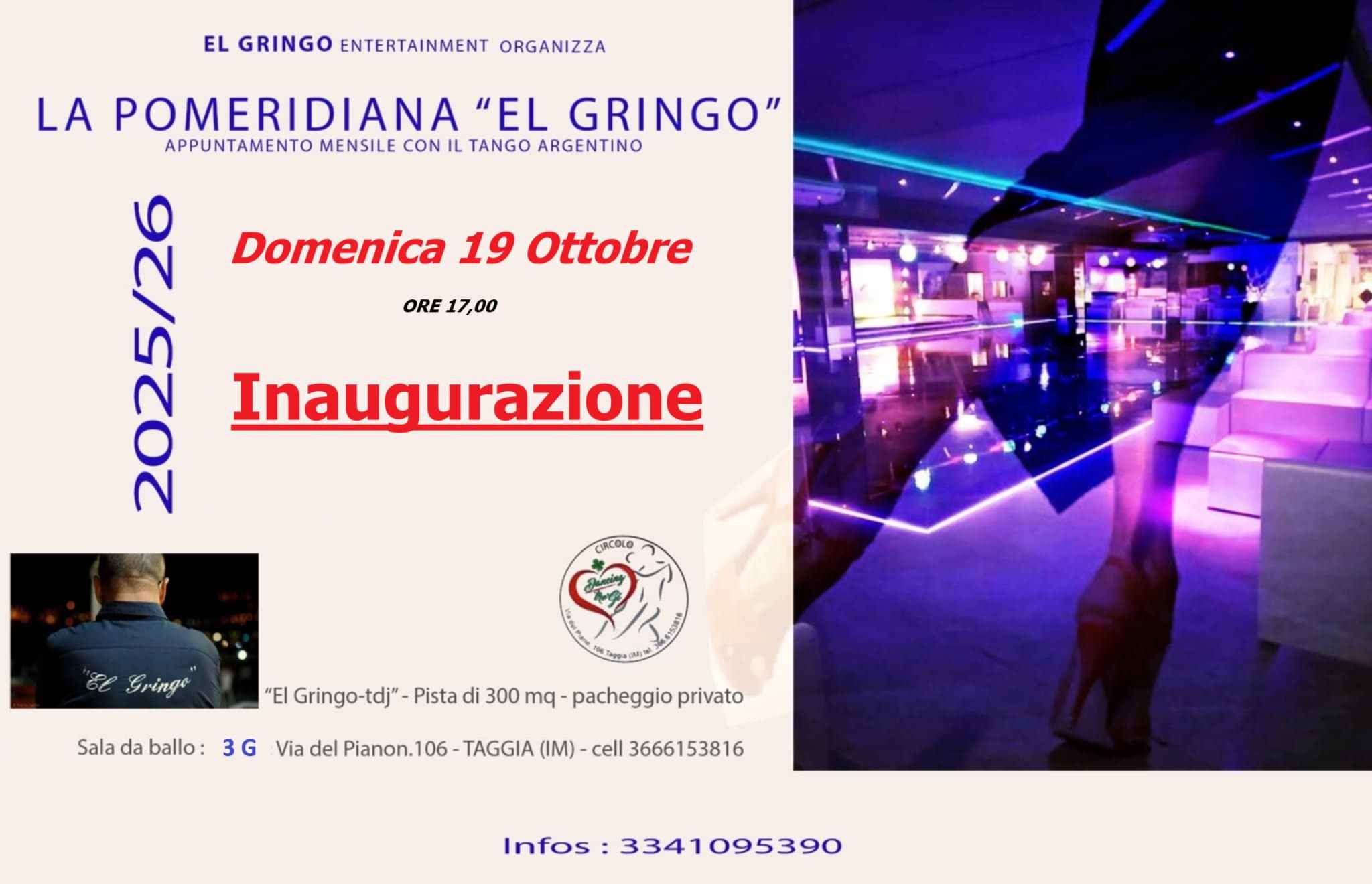 El gringo Entertainment organizza La Pomeridiana by “el Gringo” . Appuntamento mensile . Inaugurazione Domenica 19 Ottobre 2025 presso Sala da ballo 3 G in via del piano 106 a Taggia (Im).il locale con 850 mq con una pista di 300 mq dispone di un parcheggio riservato sul tetto dello stabile. Tdj resident “el Gringo” (la musica per tutti i gusti). Durante la serata verrà offerto a tutti uno spuntino con piatto caldo . E 'vivamente consigliata la prenotazione al 3341095390 con (sms) . ingresso milonga dalle 17,00 Euro 15,00. Come arrivare: con l'autostrada uscita Arma di Taggia scendere fino sulla statale Aurelia e svoltare a Sinistra Sx alla grande rotonda con le enormi olive prendere la terza uscita in direzione di Taggia , dopo circa 1,5 Km superate la rotonda che incontrate andando diritto ancora per un 500metri e troverete alla vostra sinistra un grosso stabile con l'insegna Asta del Mobile svoltate subito a sinistra ed entrate sulla rampa che porta sul tetto dove è situato il parcheggio e l'ingresso della sala. per chi arriva da Imperia o Sanremo alla grande rotonda delle enormi olive svoltare per Taggia e seguire le indicazioni sopra riportate. Info : 3341095390. En Francais : El Gringo Entertainment organise l’ «la Pomeridiana by « El Gringo ». Rendez-vous mensuel avec le Tango argentin, . Inauguration 19 Ottobre2025 à la Salle de Danse Tre g, via del Piano 106 à Taggia (Im). L'espace de 850m2 avec une piste de 300m2 dispose d'un parking réservé sur l e toit du bâtiment. tdj Resident : El Gringo” (musique pour tous les goûts). Le soir, chacun se verra offrir une collation avec un plat chaud . la réservation est fortement recommandée au 3341095390 par Sms. entrée pour les stages : € Milonga Euro 15,00 de 17h00 à 21h00. Comment arriver: prendre la sortie d'autoroute Arma di taggia, descendre sur la route nationale Aurelia et tourner à gauche au grand rond-point avec les immenses oliviers, prendre la troisième sortie en direction de Taggia, après environ 1,5 km continuer tout droit. Au rond-point , continuez pendant encore 500 mètres et vous trouverez un grand bâtiment sur votre gauche avec le panneau Asta del Mobile. Tournez immédiatement à gauche et entrez dans la rampe qui mène au toit où se trouvent le parking et l'entrée de la salle. Pour ceux qui arrivent d'imperia ou de Sanremo, au grand rond-point des énormes oliviers, tournez en direction de Taggia et suivez les indications ci-dessus.