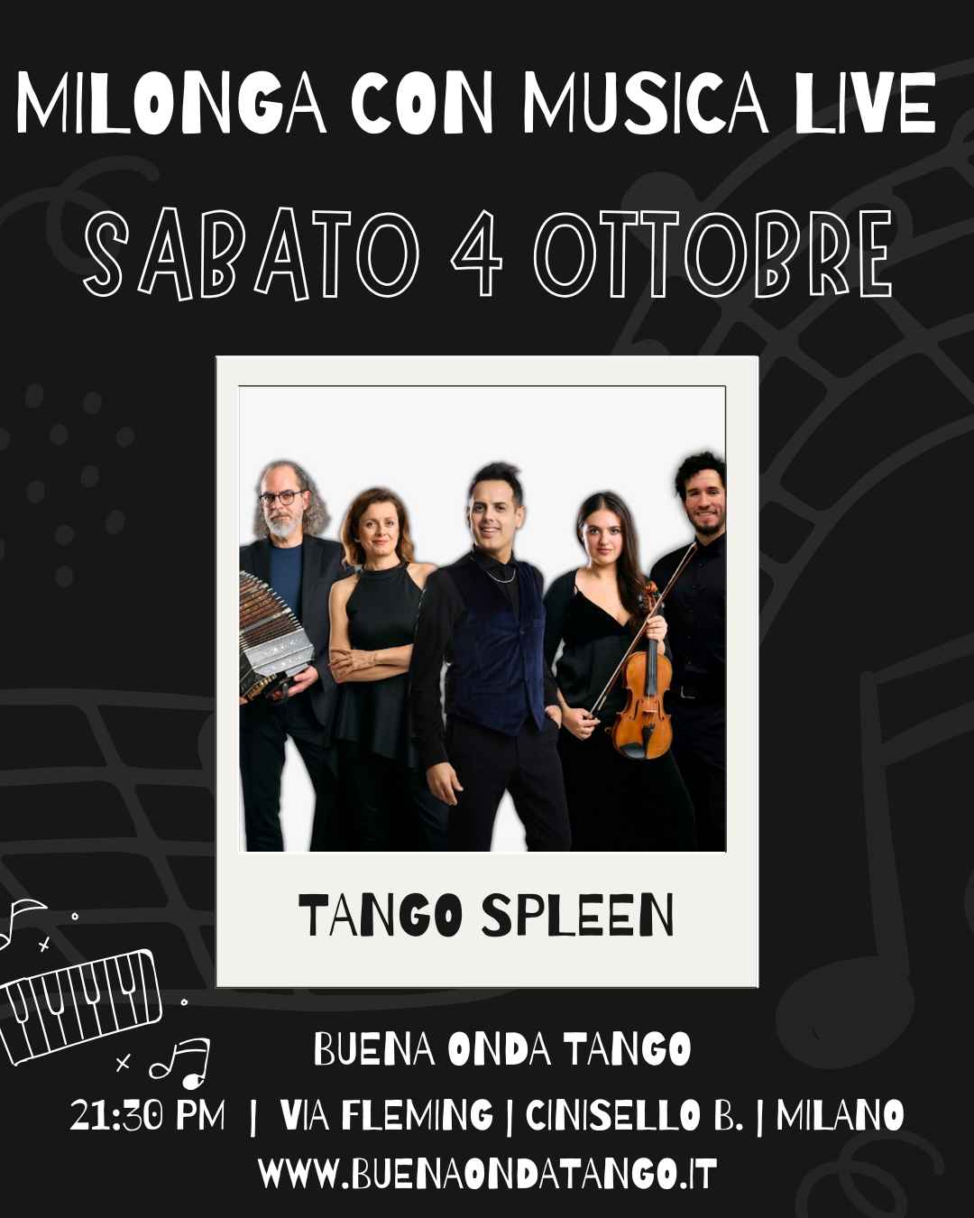 Questa settimana ospiteremo i grandissimi Tango Spleen! Un quintetto di strumenti con voce di grande tecnica e pathos per una serata di Milonga veramente emozionante!