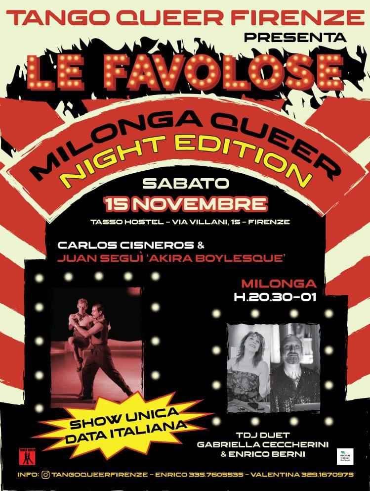 Incredibilmente Le Favolose si vestono di sera e per l'occasione ospiteranno nella loro unica data italiana un duo argentino unico nel loro genere, Carlos Cisneros e Juan Segui, coppia di spicco nel panorama del tango burlesque. animeranno la serata con il loro tocco pazzesco, facendo rimanere il pubblico spesso con il fiato sospeso.....questa non ve la dovete perdere per nessuna ragione!