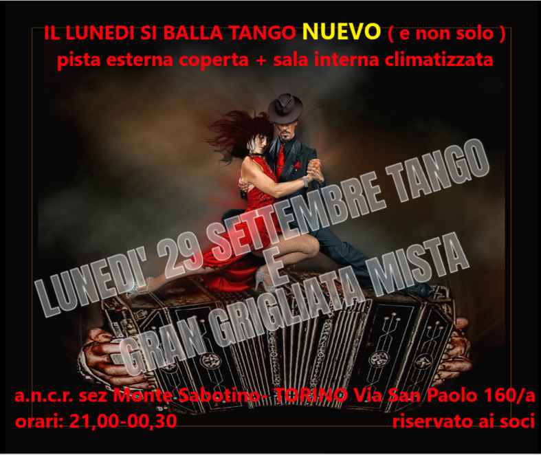 - LUNEDI’ 29 settembre 2025 si balla “tango nuevo ( e non solo )” e si gusta una gran grigliata mista di carne ( vedere menù più in basso )