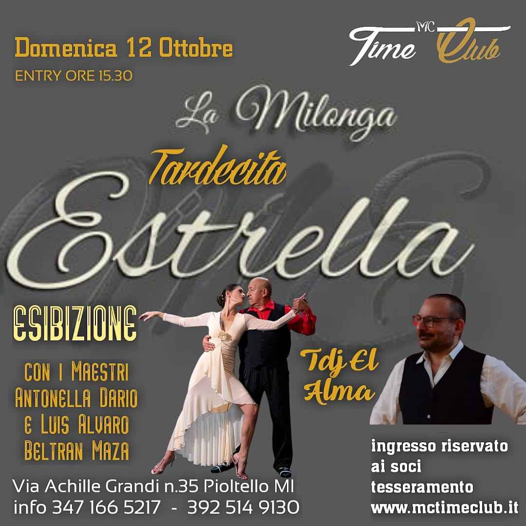 Milonga Estrella La tardecita... dalle ore 15,30 Domenica 12 ottobre 2025 Una pomeridiana ci sta.... per ritrovarci e divertirci con il buon tango e musica d'eccezione! Alla consolle: Tdj El Alma con le sue selezioni emozionanti e raffinate! Milonga sulla splendida e spaziosa pista interna! Durante la pomeridiana esibizione dei maestri Antonella Tangoymas e Luis Alvaro Beltran Maza Ingresso riservato ai soci Time Club 10€ (inclusa consumazione alcolica o analcolica) Tessera annuale: 3€ Dove?time Club Pioltello – Via Achille Grandi 35, Pioltello (Mi) Attenzione: Strada Cassanese chiusa per lavori!seguire il percorso dalla zona industriale di Pioltello, impostando il navigatore per via san Francesco, una volta arrivati impostare il navigatore per via Achille Grandi
