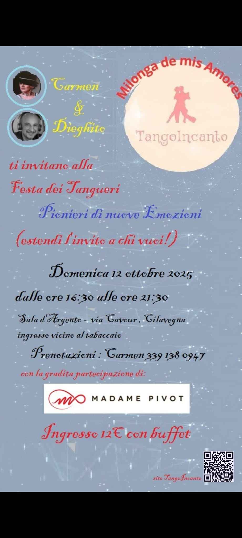 Carmen y Dieguito vi invitano alla Festa dei Tangueri Pionieri di nuove emozioni Estendi l’invito a chi vuoi tu!! Domenica 12 Ottobre 2025 Dalle ore 16:30 alle ore 21:30 Sala d’argento – Via Cavour – Cilavegna >Ingresso vicino al tabaccaio< Prenotazione Carmen : 3391380947 Durante la serata esposizione scarpe Madame Pivot Ingresso 12€ compreso di buffet.