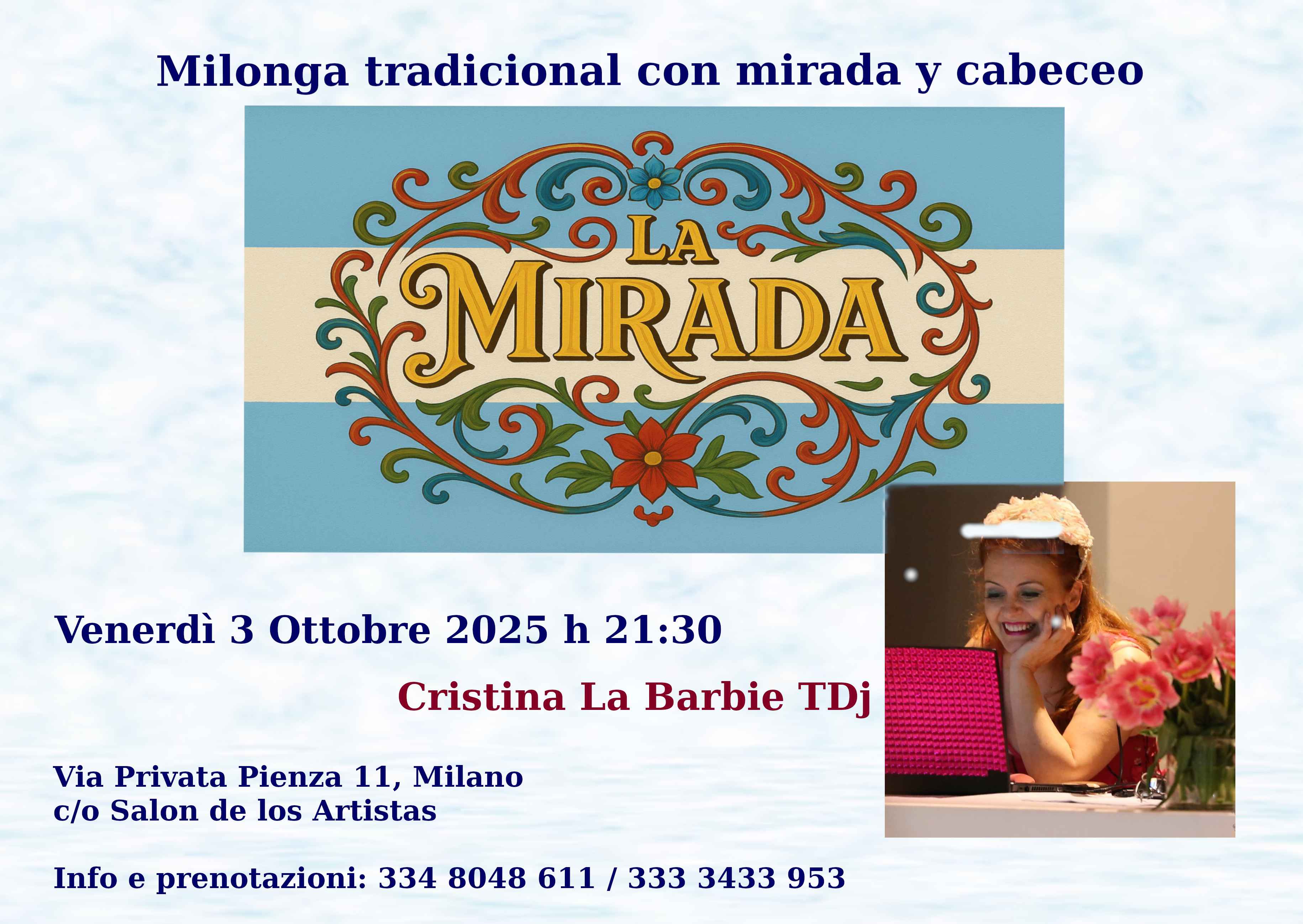 la Milonga Tradizionale "la MIRADA"un incontro con cadenza mensile pensato per ricreare l’atmosfera autentica delle sale di Buenos Aires, con il rispetto dei codigos milongueros che da sempre custodiscono l’eleganza e la magia del Tango: