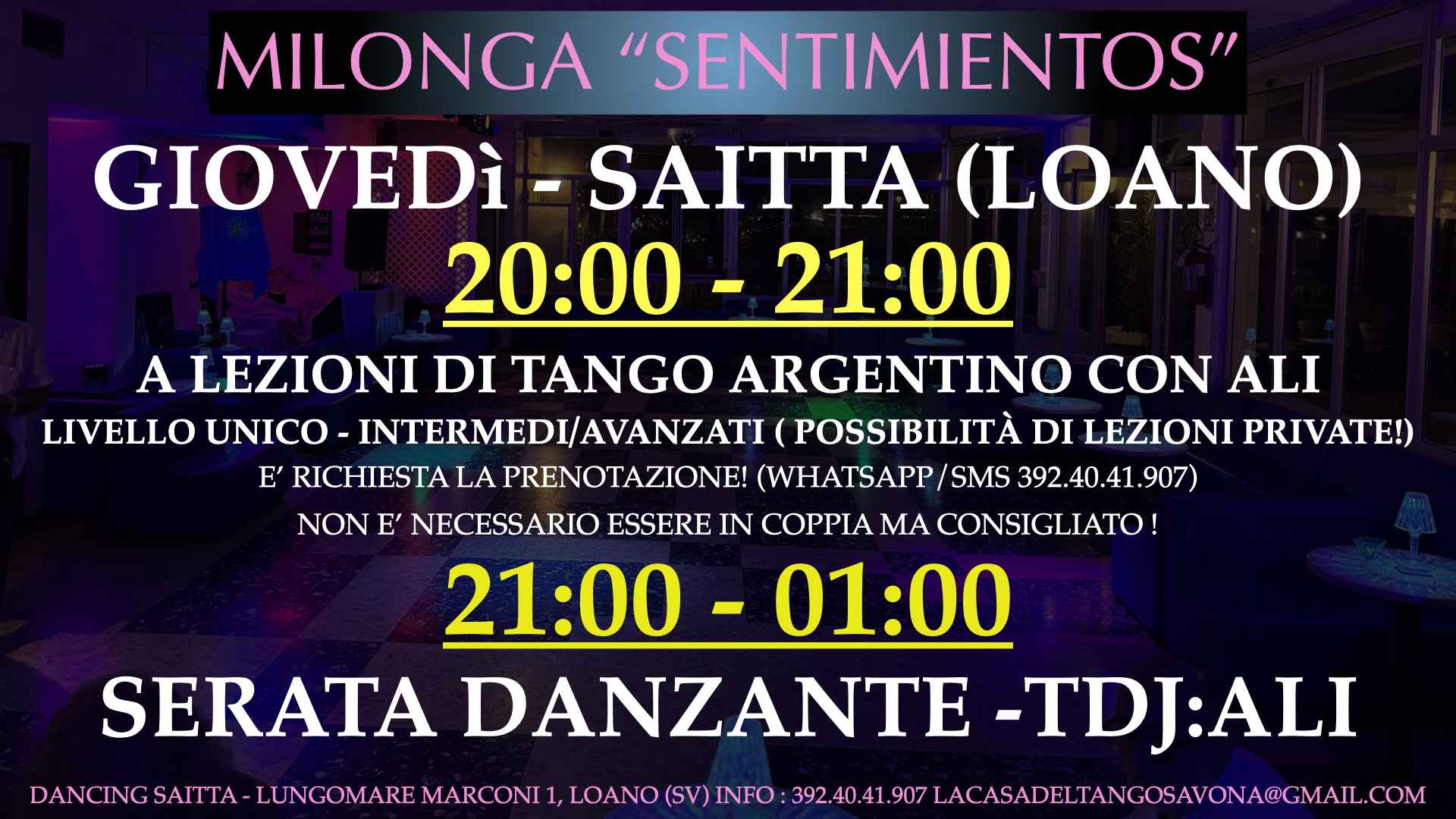😍 milonga “sentimientos” presso Dancing Saitta - Loano 21:00 - 01:00
