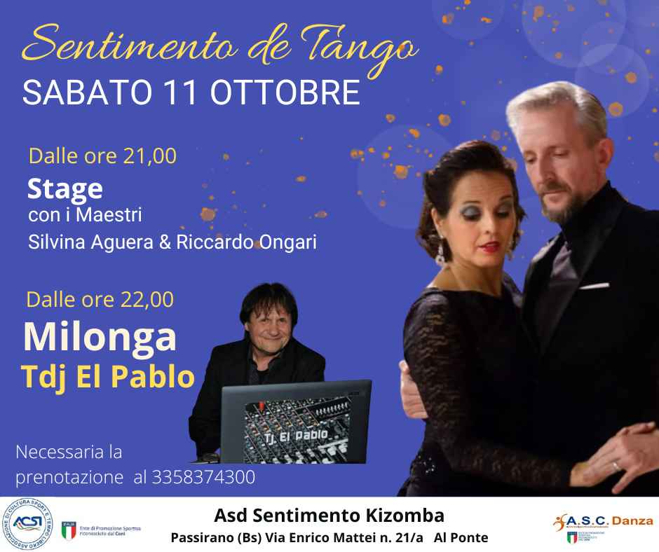 Brescia, Passirano Via Enrico Mattei n. 21/a. stage con i Maestri Silvina Aguera e Riccardo Ongari, contributo € 10,00. a seguire, alle ore 22,00, Milonga con Tdj El Pablo necessaria la prenotazione al 3358374300. garantita la possibilità di sedere a tutti i posti prenotati. l'ingresso è riservato agli associati Acsi e Asc, possibilità di tesseramento in loco. durante la serata verranno offerti stuzzichini. siamo a pochi minuti dall’autostrada di Ospitaletto (Bs) ed uscita di brescia Ovest. comodo parcheggio gratuito. …. è inclusa l’accoglienza familiare che ci contraddistingue
