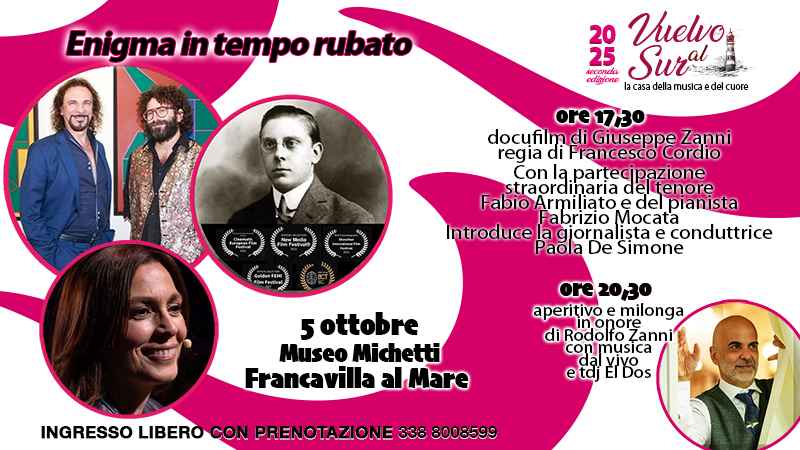 Serata dedicata al giovane talento musicale definito il Mozart argentino Rodolfo Zanni, di origini abruzzesi con docufilm dalle ore 17,30 e milonga dalle 20,30 con selezione musicale con tdj El Dos e interventi musicali di Fabrizio Mocata e Fabio Armiliatoingresso Libero Con Prenotazione Chiamando Il 338 8008599docufilm di Giuseppe Zanni, regia di Francesco Cordio con la partecipazione straordinaria del tenore Fabio Armiliato e del pianista Fabrizio Mocata Introduce la giornalista e conduttrice Paola De Simoneil film ripercorre con il rigore di un documentario la vicenda umana di successo, persecuzione e morte del giovane talento musicale definito il Mozart argentino Rodolfo Zanni (1901-1927), grande e misconosciuto compositore e direttore d’orchestra del primo Novecento, scomparso in circostanze oscure. Il film ripercorre con il rigore di un documentario la vicenda umana di successo, persecuzione e morte del giovane talento musicale definito il Mozart argentino Rodolfo Zanni (1901-1927), grande e misconosciuto compositore e direttore d’orchestra del primo Novecento, scomparso in circostanze oscure.