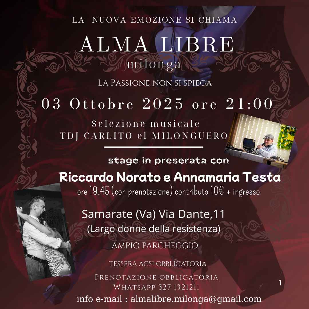 Il Venerdì sera è Tango, Il Tango è Alma Libre ! Alma Libre, la milonga degli abbracci veri, della musica che emoziona in un’atmosfera calda e libera proprio come il tango.    Stasera Musicalizza: Carlitos el Milonguero Tdj