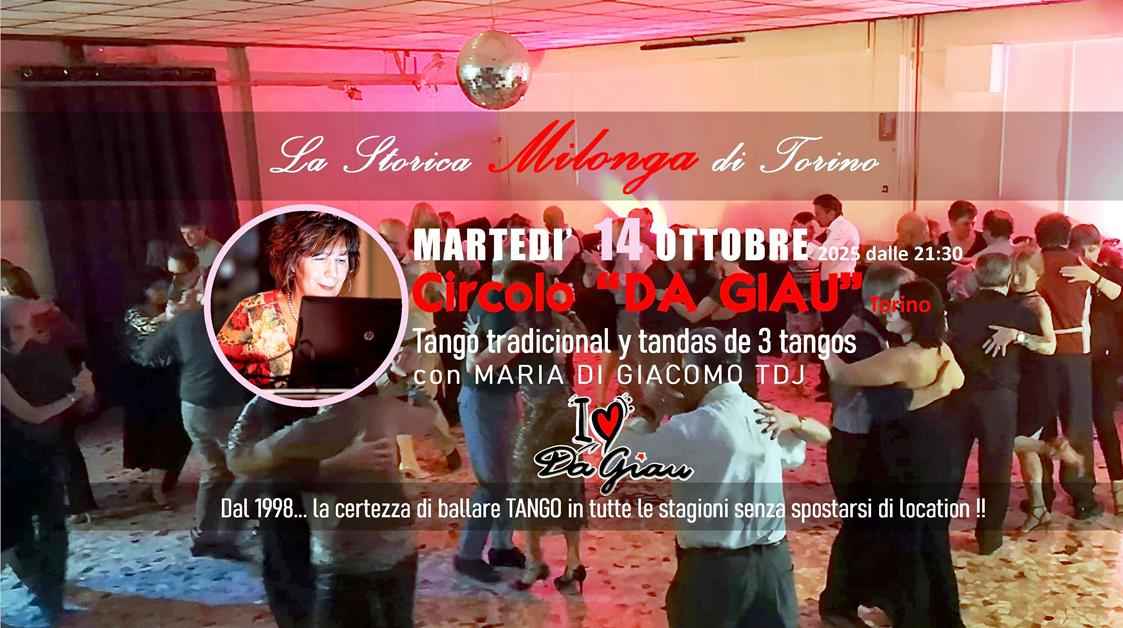 Il circolo "da Giau" propone una serata interamente dedicata al Tango Argentino, che, con oltre trent'anni di attività ininterrotta, rappresenta l’appuntamento storico e più duraturo nel panorama delle Milonghe Torinesi. A partire dalle ore 21:30 tutti gli appassionati di questa sensuale danza potranno abbandonarsi sulle note dei più bei temi delle Milonghe di Buenos Aires.