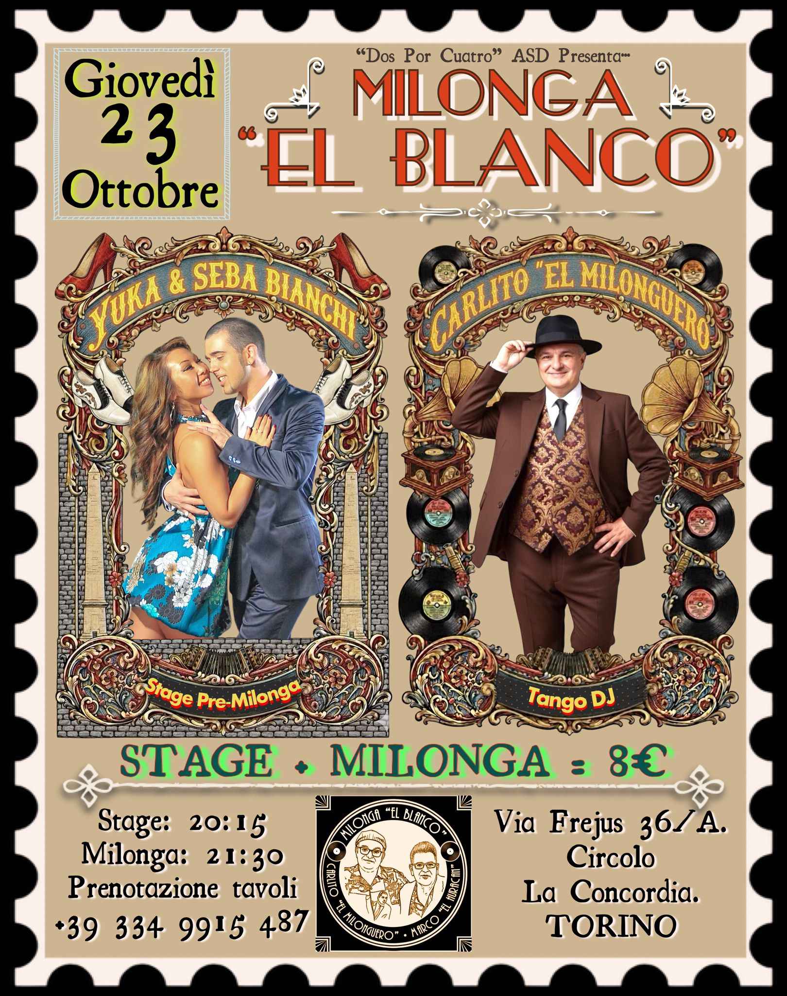 🪩milonga El Blanco 🗓️giovedi 23 Di Ottobre ⚜️stage Pre~milonga con 💃yuka & Seba🕺 🕣20:15~21:15 stage!! dopo fino all’una Milonga con 🎶tdj Carlito “el Milonguero”!!!💰 Stage + Milonga= 8 € 📍 Circolo “la Concordia” Via Frejus 36 Torino.🅿️parcheggio interno disponibile solo lato ingresso milonga.🍹 Disponibile il servizio bar interno alla sala.🚸info Stage Y&s +39 327 85 60 253🪑 Prenotazione tavoli al Numero +39 334 99 15 487 è consigliata!👉link Evento: y&s👨💻website: https://nuestrotangodance.wixsite.com/yuka-seba/it🤗Il Giovedì è meglio con voi!! Ci vediamo!!