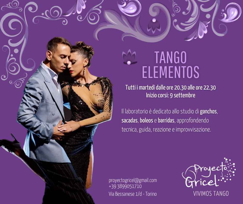 Tango Elementos (Intermedio/avanzato) gli obiettivo di questo gruppo di lavoro è lo studio approfondito dei 4 grandi elementi del tango, ganchos, sacadas, boleos e barridas. Le radici, la tecnica, la guida, la reazione, l'improvvisazione, la creazione e le loro combinazione.