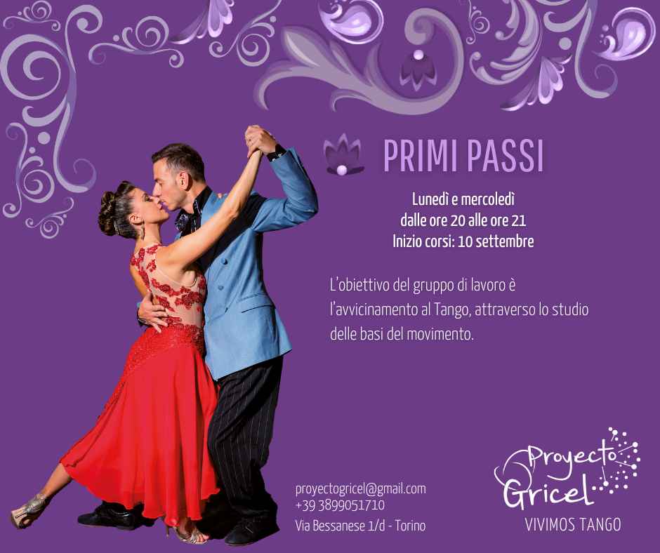 Primi Passi: l'obiettivo del gruppo di lavoro è l'avvicinamento al Tango, attraverso lo studio delle basi del movimento.