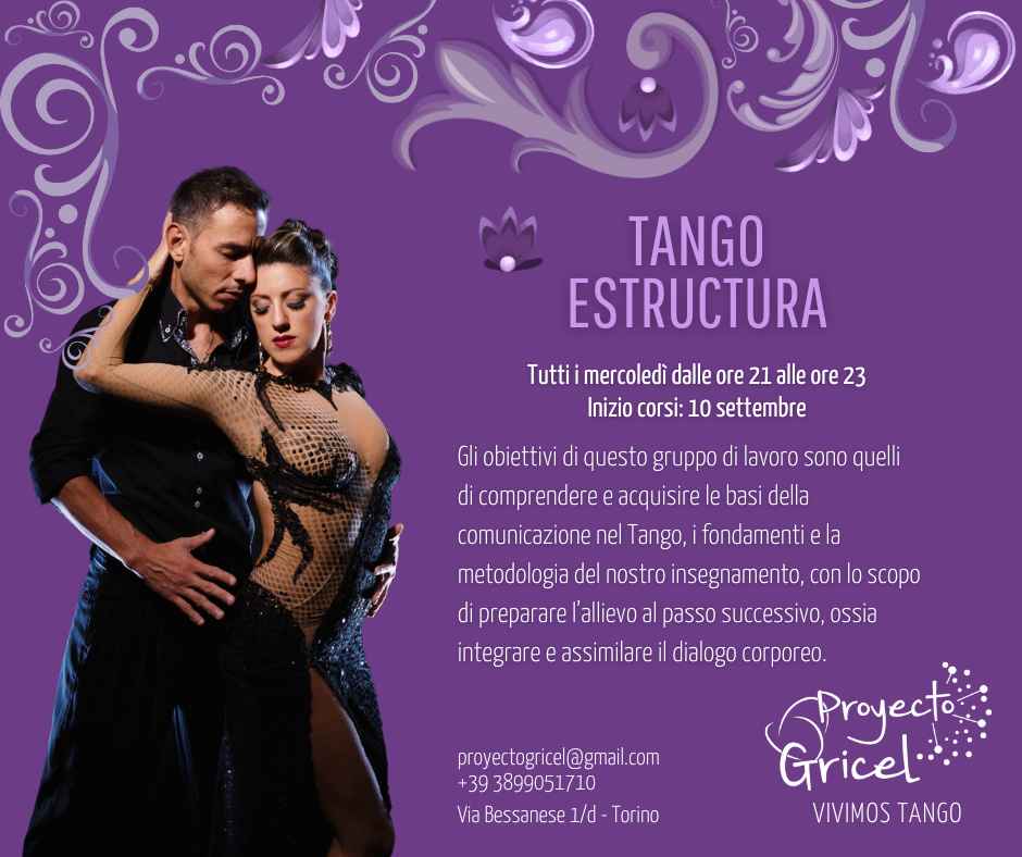 Tango Estructura (Principianti/intermedio) gli obiettivi di questo gruppo di lavoro sono quelli di comprendere e acquisire le basi della comunicazione nel Tango e i fondamenti e la metodologia del nostro insegnamento, con lo scopo di preparare l'allievo al passo successivo, ossia integrare e assimilare il dialogo corporeo.