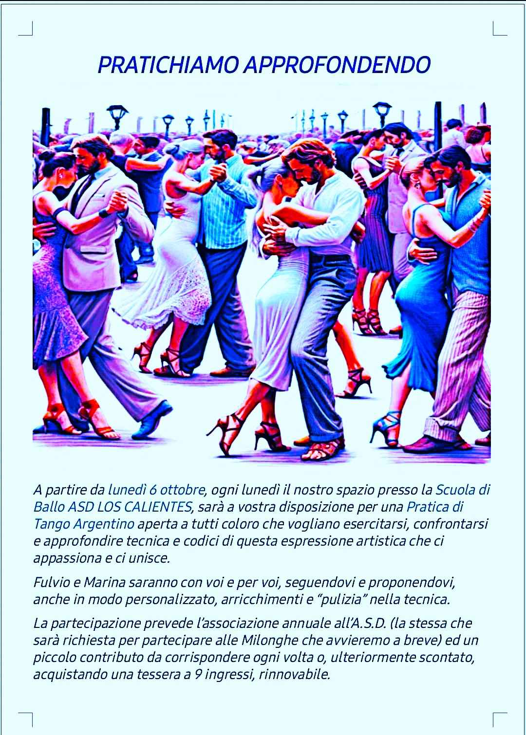 Ogni Lunedì, dalle ore 21,30 alle 23, la Scuola A.s.d. Los Calientes apre i suoi spazi ad una pratica assistita dai maestri Marina e Fulvio.Lo scopo è quello di provare quanto appreso, sperimentare dinamiche, richiedere consigli anche di postura e tecnica.