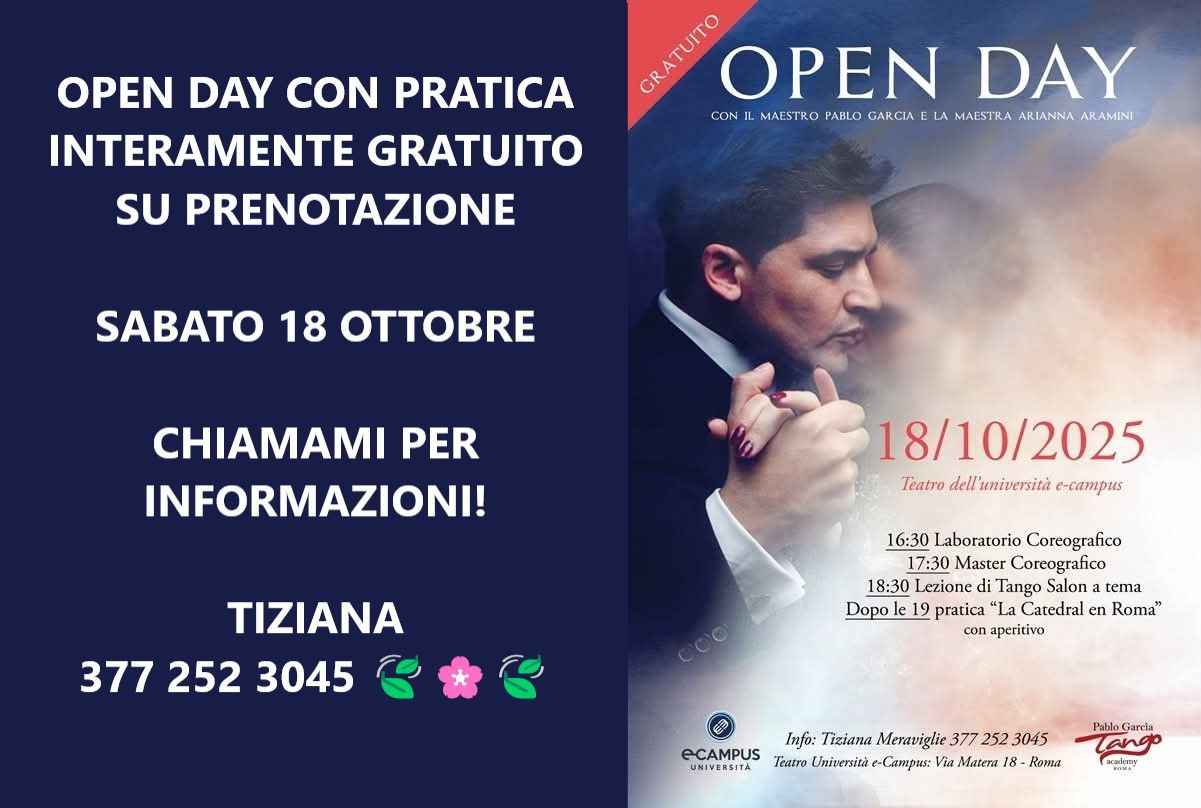 Sabato 18 Ottobre 2025 Open Day Gratuito Aperto A Tutti!vi aspettiamo nella splendida sede romana dell'università ecampus con i maestri Pablo Garcia e Arianna ARAMINI!