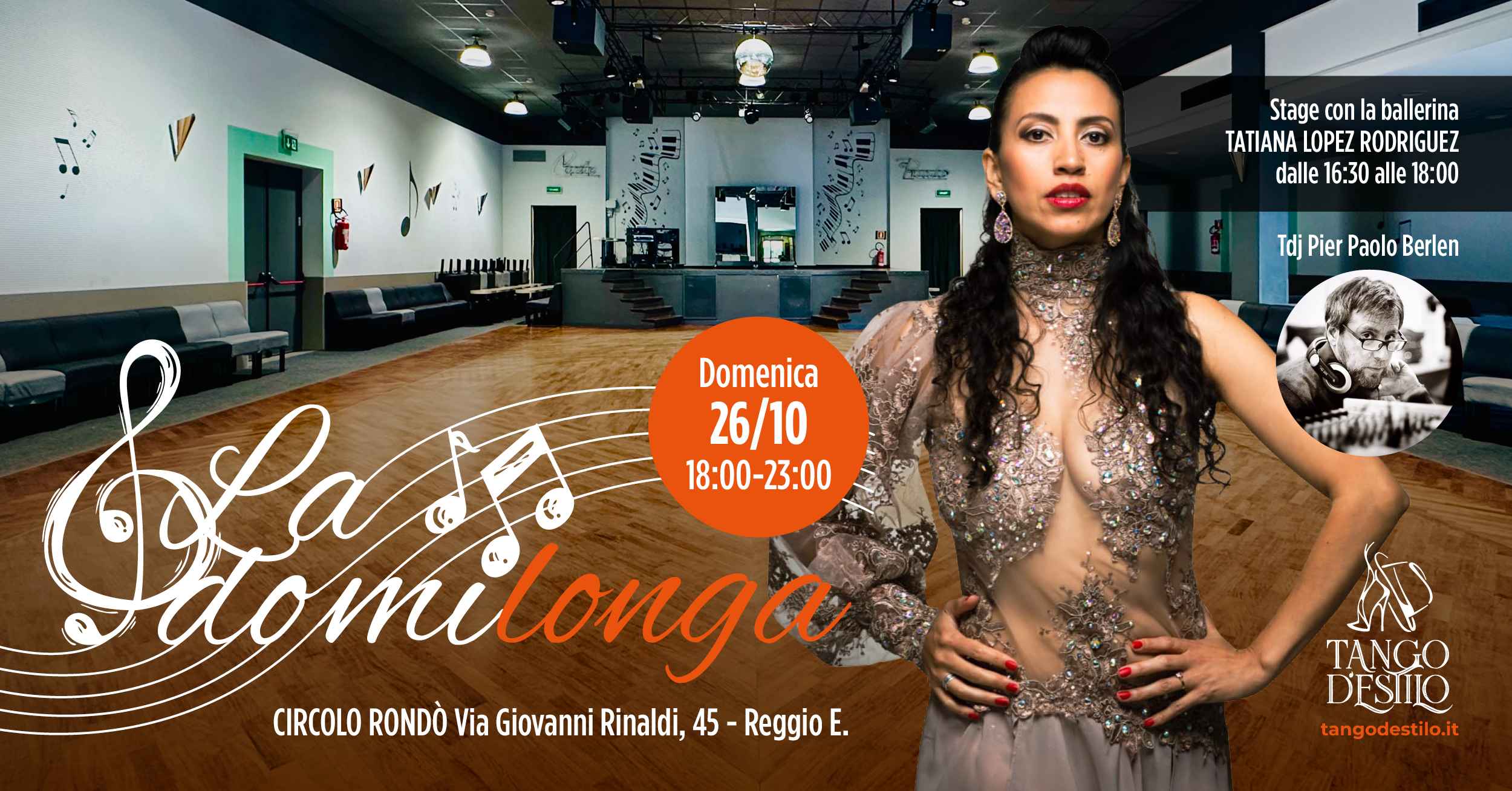 Appuntamento domenicale con La Do Milonga!! Circolo Arci Rondo’ (Via Giovanni Rinaldi 45 Reggio Emilia)   Ospite Tdj Pier Paolo Berlen   Stage dalle ore 16.30 alle ore 18.00 della ballerina tatiana Lopez RODRIGUEZ   Ora inizio Milonga: 18:00 Ora fine Milonga: 23:00   Contributo Stage + Milonga 25 euro Contributo solo Milonga 15 euro   Per avere informazioni o prenotare un tavolo potete inviare un messaggio whatsapp con nome e cognome al 3930421099 (Francesca)   NB: si ricorda che l’evento è accessibile solo a chi in possesso di tessera A.r.c.i.   ​Alcune Informazioni su Tatiana Lopez Rodriguez ballerina, insegnante e coreografa di tango argentino e arti performative. Ha iniziato gli studi di tango alla Scuola Piazzola nel 2002, ha approfondito le sue conoscenze presso la scuola preparatoria della Scuola d'arte di Bogotà (Asab) e ha continuato a espandere la sua carriera artistica presso la Escuela de Formación de Arte (Efa). Si è distinta come artista in progetti nazionali e internazionali e ha portato la cultura del tango in paesi come Colombia, Argentina, Giappone, Brasile, Corea del Sud, Indonesia e altri. nel corso dei suoi oltre 20 anni di esperienza, ha partecipato a spettacoli di tango in tutto il mondo con compagnie di danza e direttori nazionali e internazionali, in città come Bogotà (Colombia), Buenos aires (Argentina), Tokyo (Giappone), Bali (Indonesia), Seul (Corea del Sud) e altre città latinoamericane e asiatiche. Si è distinta partecipando a campionati locali e mondiali,arrivando al primo posto nel Campionato Mondiale di Tango e nel Campionato Metropolitano di Tango a Buenos Aires, nell'indonesia championship Preliminary, nel Pacific Tango Championship a Seul, nel Tango Via championship a Manizales e in altri. ha vissuto a Buenos Aires, in Argentina, per nove anni e a tokyo, in Giappone, per quattro anni, dal 2015 al 2018, insegnando e praticando tango. Attualmente risiede in Colombia e, dal 2019, rappresenta artiste nella comunità di Antonio Nariño, in collaborazione con la Fondazione Gimnasio emocional Mendes Brillantes, rafforzando le politiche pubbliche per l'equità femminile e la parità di genere, portando arte e cultura alla comunità e alla città di Bogotà. premi campionato Tango Via - Primo posto – 2024 – Manizales, colombia coppa Don Quijote - Primo posto – 2023 – Cebu, Filippine campionato di Tango del Pacifico - Terzo posto – 2023 – seul, Corea del Sud campionato Indonesia - Terzo posto – 2023 – Bali, Indonesia campionato Asiatico di Danza Tango - Primo posto – 2023 – tokyo, Giappone manizales è Tango - Secondo posto – 2019 – Manizales, colombia campionato di Tango di Manila - Primo posto – 2016 – Manila, filippine campionato Mondiale di Tango - Terzo posto – 2013 – Buenos aires, Argentina campionato Mondiale di Tango - Terzo posto – 2011 – medellín, Colombia campionato Intercontinentale - Primo posto – 2010 – Buenos aires, Argentina campionato Internazionale di Tango di Cali - Primo posto - 2009 - Cali, Colombia campionato Mondiale di Tango - Decimo Luogo - 2007 - Buenos aires, Argentina carriera Artistica artista ospite 2° Festival del Tango Tailandese - 2018 - Bangkok, Tailandia tango Buenos Aires vol. Ii - 2015 - Tokio, Giappone festival del tango di Rio - 2014 - Rio de Janeiro, Brasile espacio Cultural – 2013 – Porto Alegre, Brasile el Toro Gordo - 2006 - Maturín, Venezuela tango Feroz - 2005 - Cartagena, Colombia insegnamento 1 febbraio 2019; 2 febbraio 2024 - Bogotá, Colombia - fundación Social Mentes Brillantes