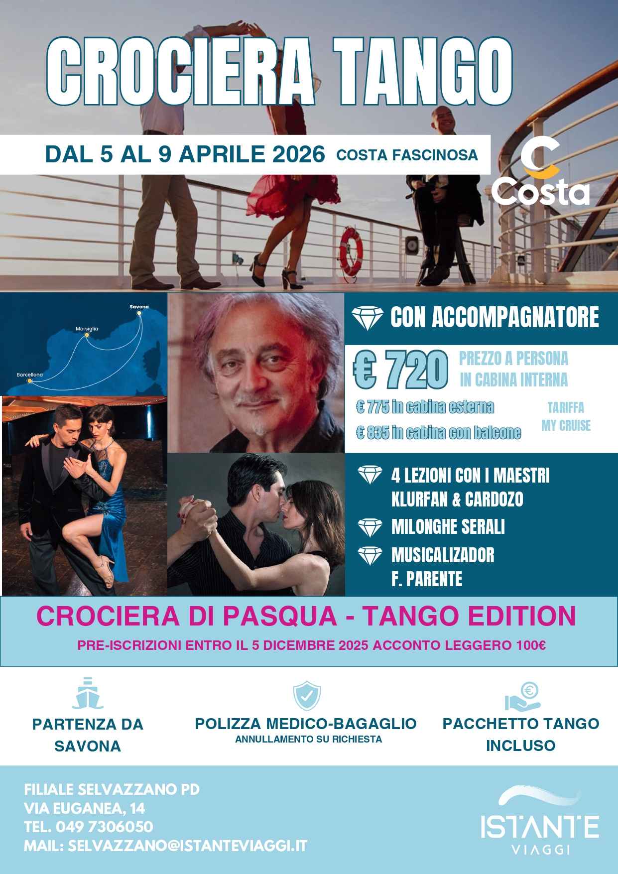 🌊💃 Crociera di Pasqua – Tango Editiondal 5 al 9 aprile 2026 a bordo della costa Fascinosa itinerario: savona – Marsiglia – Nareallond – Costaun’esperienza unica tra mare e milonga, pensata per chi ama il tango e vuole viverlo in un’atmosfera magica e rilassante.