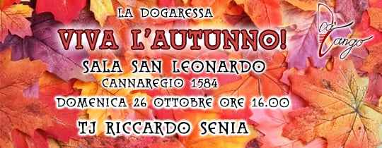 Eccoci, per salutare l'autunno che viene, si riprendono le strabilianti pomeridiane nella sala S. Leonardo. Domenica 26 ottobre dalle ore 16 alle ore 21. Come da tradizione, pantagruelico buffet con beveraggi. Sorteo di ricchi premi e cotillon. Tema dress code: tutti i colori autunnali. Tessera aics. Contributo soci 15 euro. Siamo a 7 minuti dalla stazione ferroviaria e a 10 dal terminal auto di p. Roma Ce le suona tj Riccardo SENIA gradita moltissimo la prenotazione.